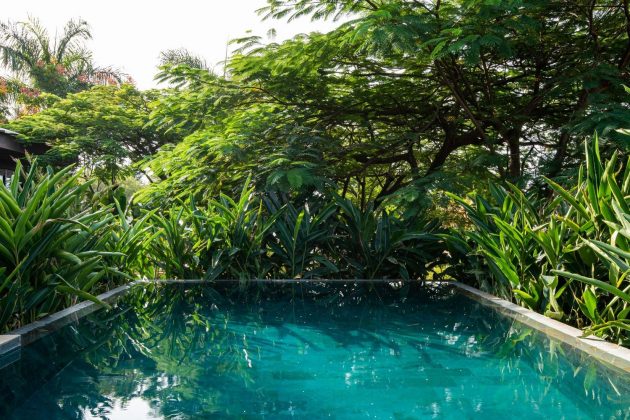 The residence adopts an L-shaped configuration, with the entertainment and pool areas oriented toward the center of the plot and the private bedrooms aligned toward the side garden. This layout creates a clear distinction between social and intimate zones, while also ensuring that the pool and outdoor living spaces receive abundant sunlight throughout the day.