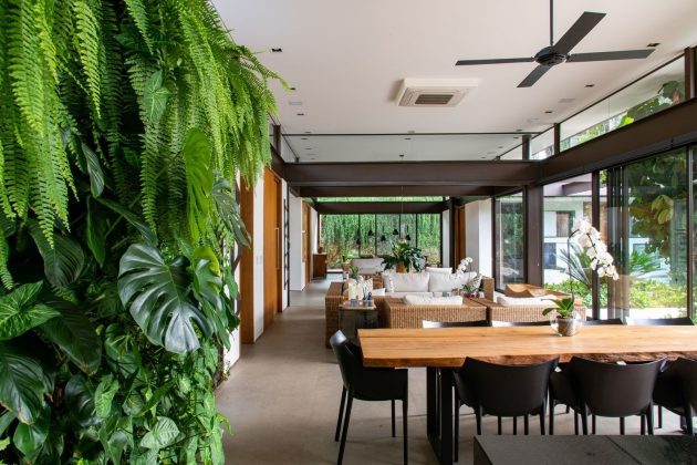 Upon entering the home, there is a living and dining room to one side and a gourmet area to the other. Designed to meet the family’s hosting and day-to-day living needs, the spaces can be completely integrated or separated by a glass division, allowing for more privacy when needed.