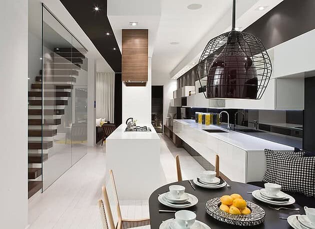 Cecconi Simone conceived the interiors and custom fixtures for the three unit types within the community – 4.1 meter-wide, 4.6 meter-wide and 5.8 meter-wide. The ground level and third floor of the 4.6 meter unit are represented in the model, in a clean palette of white, black, walnut and yellow.