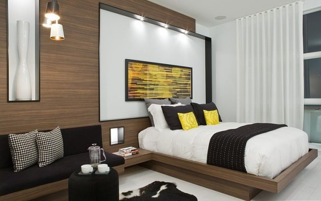 The master suite features a custom walnut-laminate sleep unit, incorporating a bed, side tables, sofa and display niches with LEDs. The ensuite contains a specially-designed vanity with integrated white Corian sinks, counter and backsplash and open and closed storage cabinets in white and walnut laminate. Custom wall-mounted medicine cabinets are accessed via a pivoting mirror.