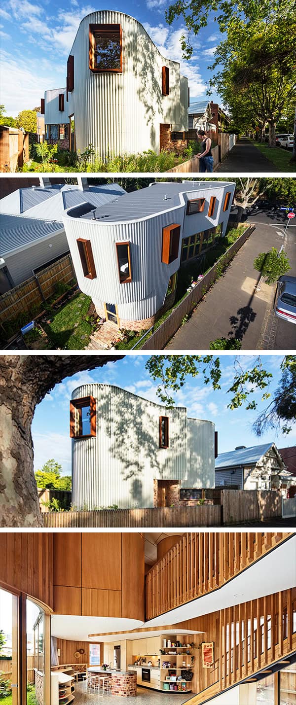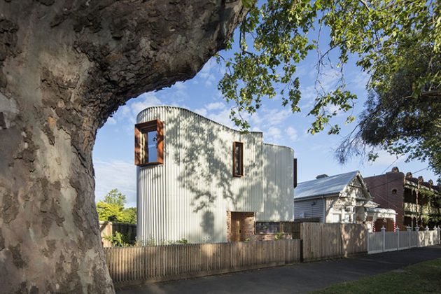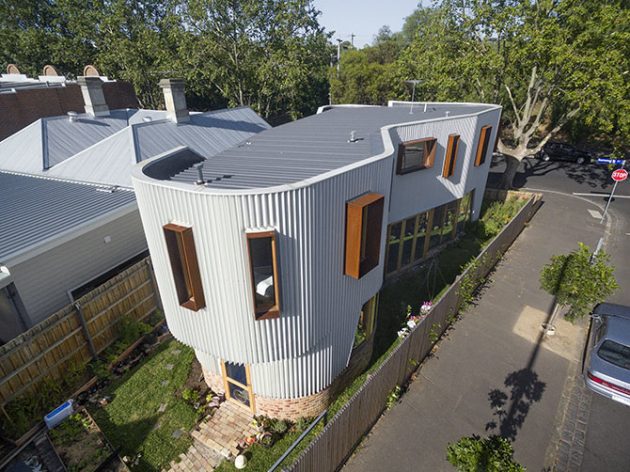 Tandem, a Melbourne-based studio, have designed the True North House in the Kensington neighborhood of Melbourne. This home is very unique, starting from its exterior, it is full of creative solutions all the way to the interiors. First of all, its corrugated metal exterior is curved and the house takes on an unusual shape because it is located on a triangular plot that was occupied by a worn out 1950s cottage with a stable.
