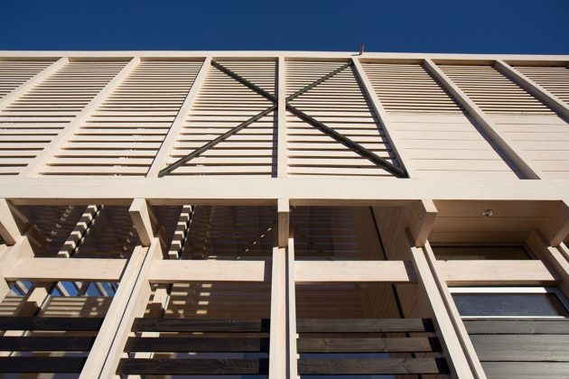The construction logic of the wood, through columns that are close among themselves, with short beams, and short cladding between the columns, allows for the correct performance of the material, avoiding deformations. The column system allows transparency to generate sea views to the south and to allow the sun light to come from the back or north side. (The sun comes from the north on the southern hemisphere). Apart from the main structure, 2 secondary structures are added: in the service areas, such as kitchen or bathrooms, short cladding walls are located between columns, and in the public areas wooden louvers between columns are located to avoid sun excess from the north and to allow some privacy from the neighbors views.