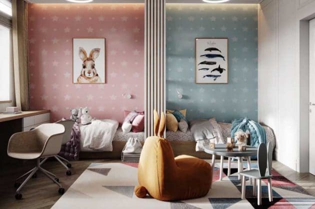 In this case, a good option is to keep a neutral base – white, gray, beige – and brush colors in the details of the room. Here, parents can choose a color for each child and mark each child’s space with it, without necessarily falling into the obviousness of blue or pink.