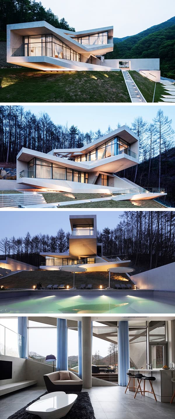 IDMM Architects have designed the U Retreat at the core of the Sari-Gol Valley in Hongcheon, South Korea. Being at the core, the plot is commonly windy. The residence has been designed in a way to unify itself with the nature that surrounds it, therefore embodying the cliff’s movements and dynamics. This not only liberates the residents from the confines of a very typical household, it also lessens the effect of the strong winds.