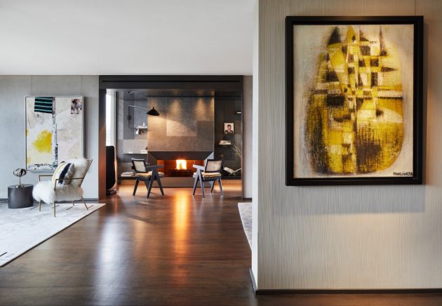 As being one of the first important renovation decision of the house was by retouching and re-polishing the existing dark reddish mahogany parquet flooring, into darker brown toned color to unite the space and to be able to make the artworks stand out in an unsaturated toned interior. On the two opposite sides of the salon, there are two functional space to enjoy, one is for fireplace and other side is for exclusively designed minibar unit.