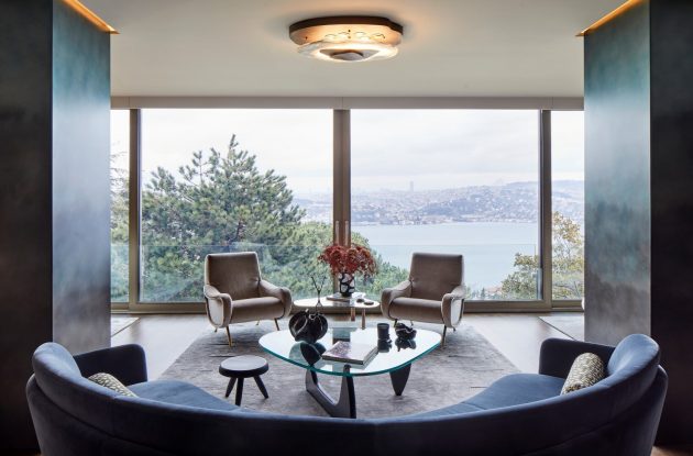 As you enter the living room, stepping up half floor from the entry door, wide glass façade viewing the Bosporus is like a framed artwork which is a part of every section of the grand living salon. The two columns which are right in the middle of the space acts a separators of the 3 sections of the grand salon.