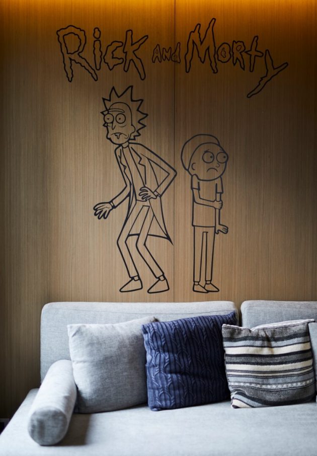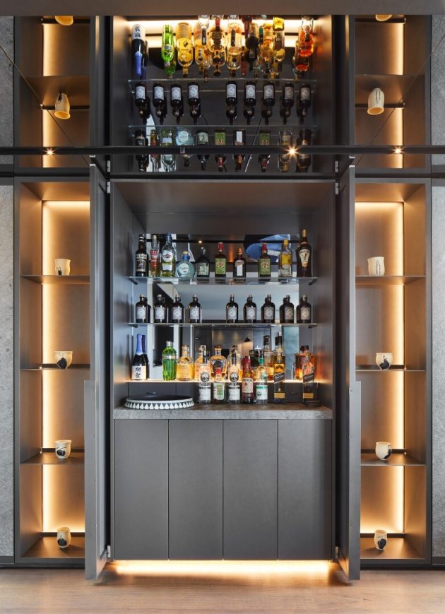 On the other side of the salon the minibar unit is placed for preparation of cocktails for enjoyment during house parties. The design of the minibar were made such as that on a normal day it would be hidden behind a tinted tubed glass sliding panel doors. On the ends the stone covered panel doors created for hidden storage for glasses and bottles, so that the bar unit is not catching the eye with busy view of bottles glasses and preparation bar counter.