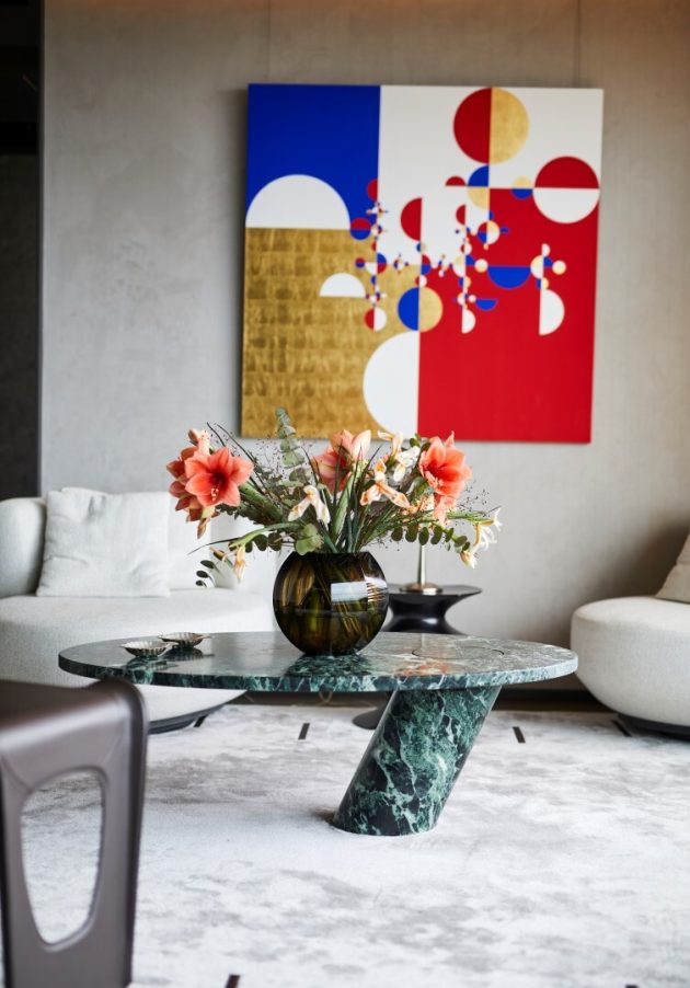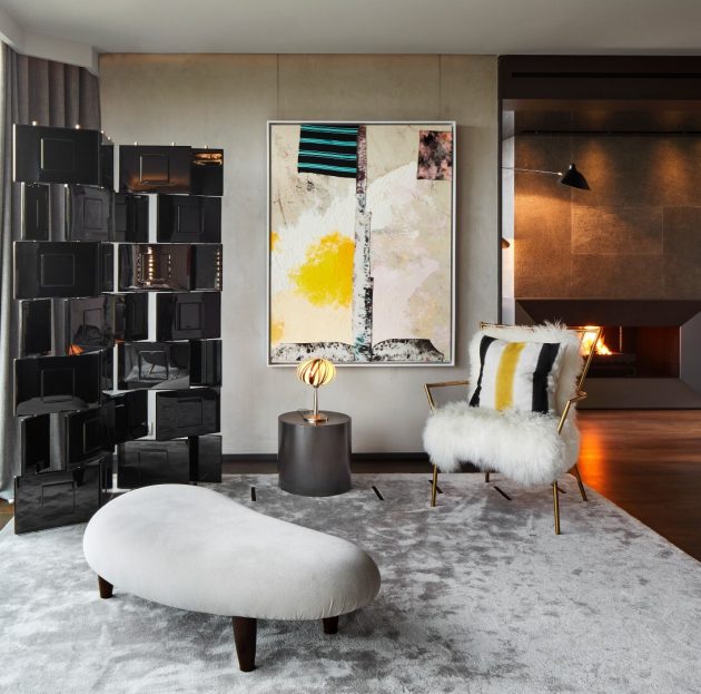The furniture and lighting selections were made very carefully with the high taste of the client, some pieces of iconic pieces of furniture from very important designers of the 20’ and 50’s. These include the iconic very famous Naguchi Coffee table by Isamu Naguchi by Vitra. The elegant Totem lamp by Serge Mouille which stands like a sculpture on the one side of the corner. On the opposite side of the Salon, Eileen Grey Brick screen stands with its elegant form by fascinating the viewer, and one can admire the design of 1920’s by Eileen Grey. This famous screen is more than just a divider, commands the presence of a sculpture with in the salon.