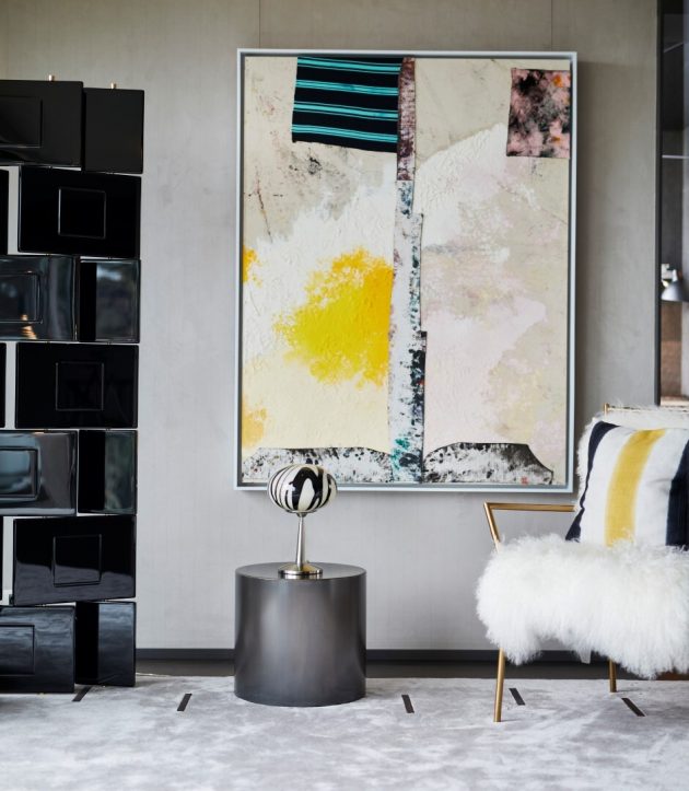 All the grand salon walls were covered with suede finish wall paper, made a soft and subtle background for the giant and very valuable art pieces of the family. The lively color of the artworks gave the dynamism to the whole space.