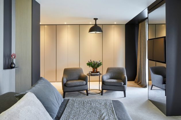 On the fireplace side, pre-existing basalt façade was recovered by texture dark grey stone sheets to refresh its old look. As the fireplace wall was being covered, we designed to insert paper thin shelving units for displaying collected books and art pieces of the family. On the left narrow side of the fireplace Serge Mouille designed (1953) wall light was placed to give the balance to asymmetrical wall with its powerful design which serves as an art piece on the wall with giving a dramatic light at night. In this area, adding dark mirrored paneling on the ceiling, gave great depth to this narrow pockets of the grand salon also reflects image of the beautiful magnolia tree in the garden into the salon.