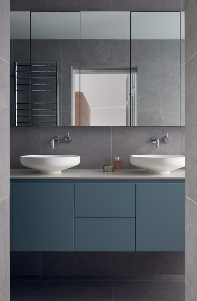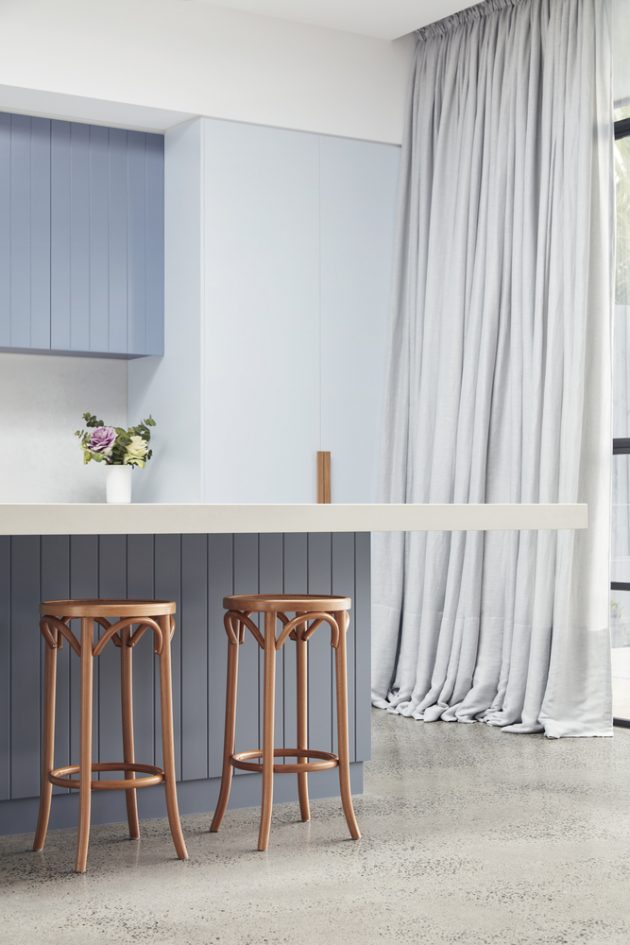 This unveiling of the original house’s red bricks was a stand out moment during the construction phase as we could all see it suddenly coming together as one cohesive design. Internally, we wanted to create warmth and softness to contrast the hardy exterior material palette and establish a seamless transition between the old and new. Internal steel framed doors mark the transition threshold which is further enhanced with a floor finish change from timber to a hydronic heated, concrete slab. Soft blue and contrasting dark blue/grey tones were teamed up with light timber joinery to create an interior color palette that emanated a sense of calm and tranquility from the hustle and bustle of daily life, and the busy main road location.