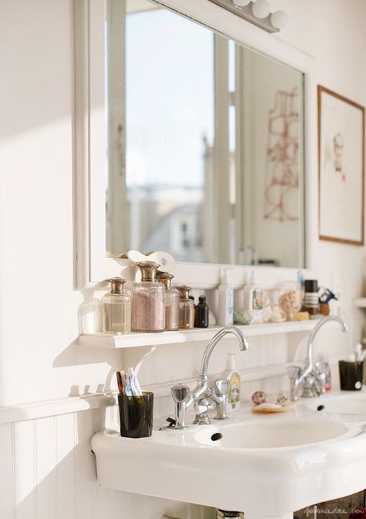 A bathroom is a place where we put in order our personal stuff for daily care, such as brushes, lotions, daily routine bottles, perfumes etc. We accumulate a multitude of them, and if they are scattered on the sink or the countertop it will create an unpleasant feeling of disorder, and we don’t want that for sure! A shelf between the sink and the mirror can be the perfect solution. On this shelf, we can place everything that’s needed daily for us, without losing its trace or causing any disorder in the bathroom.