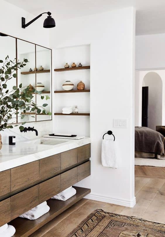Shelves are the greatest allies to getting things organized in the bathroom. Not to mention that they can be pretty simple yet very stylish and decorative. They are available in all kinds of materials and finishes so it won’t be a problem for you to find the ones that best fit the style of the bathroom.