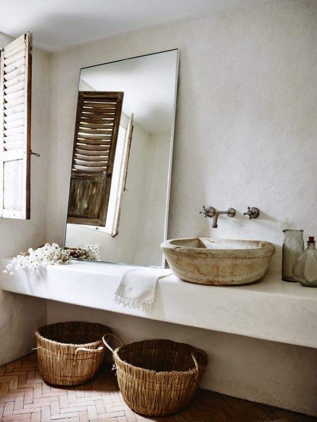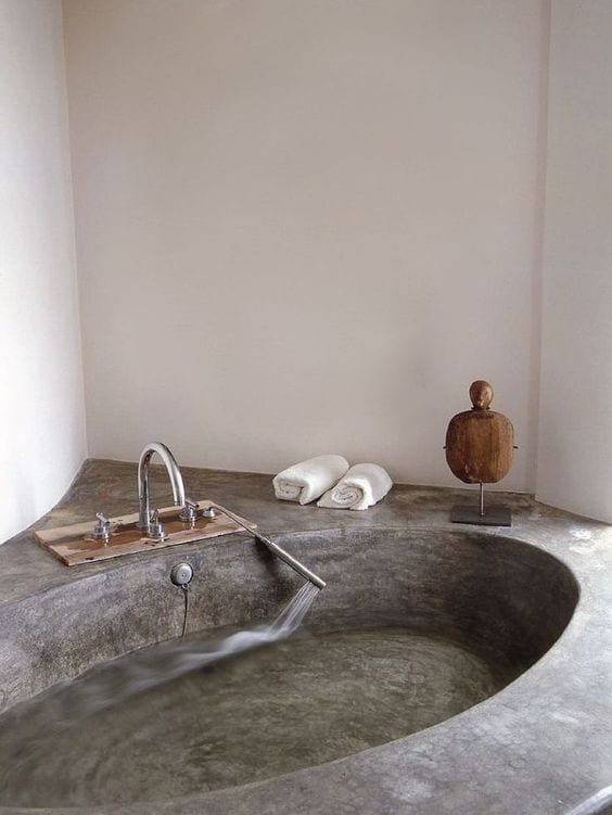 The wabi-sabi philosophy, since we no longer speak of style, likes rustic, industrial, tropical atmospheres… in fact all rough styles which favor imperfection. Bright atmospheres are also very suitable for the wabi-sabi style. The style is softer, more zen, more hygge. All you need is pretty natural stone sinks placed on a mottled piece of furniture. Fans of the wabi-sabi style love concrete, which is not a very natural material, but the raw finish is perfect.