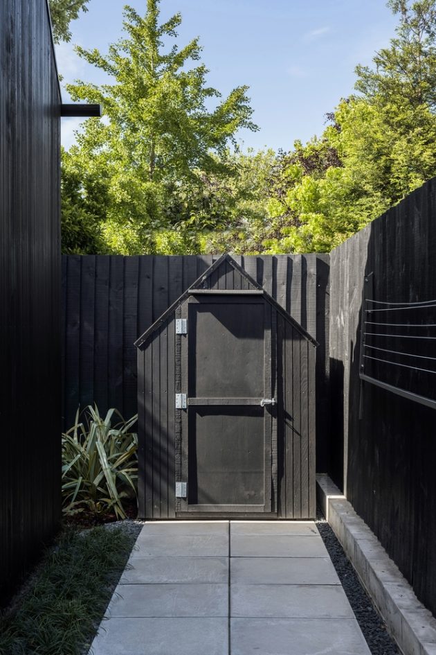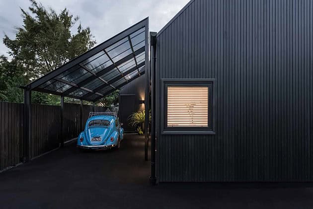 The historic Christchurch Workers Cottage was traditionally clad in brick of horizontal timber weatherboards. Given the poor soil quality of this particular site and the high seismic activity in the Canterbury area, a lightweight cladding system had to be used. The Architect selected a square profiled Western Red Cedar vertical Shiplap weatherboard (by Herman Pacific) to reference the traditional building materials, while giving the house a more clean and contemporary aesthetic. The exterior was then stained in Resene Waterborne Woodsman CoolColourTM tinted to ‘Pitch Black’. Resene CoolColourTM technology was used to minimize heat build up created by the dark coloring, in turn reducing movement of the timber wall cladding.