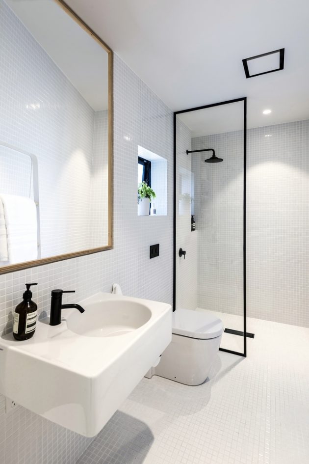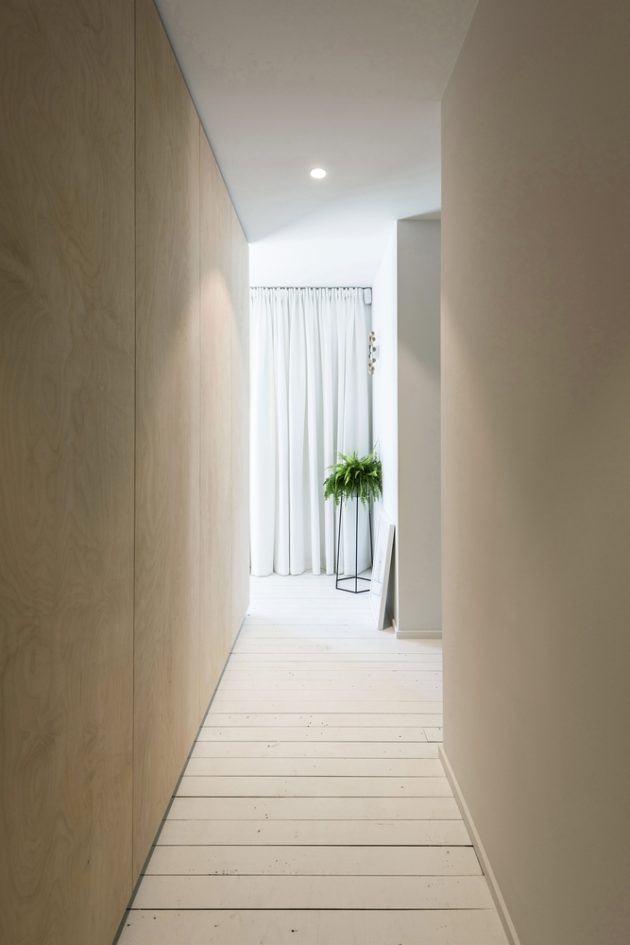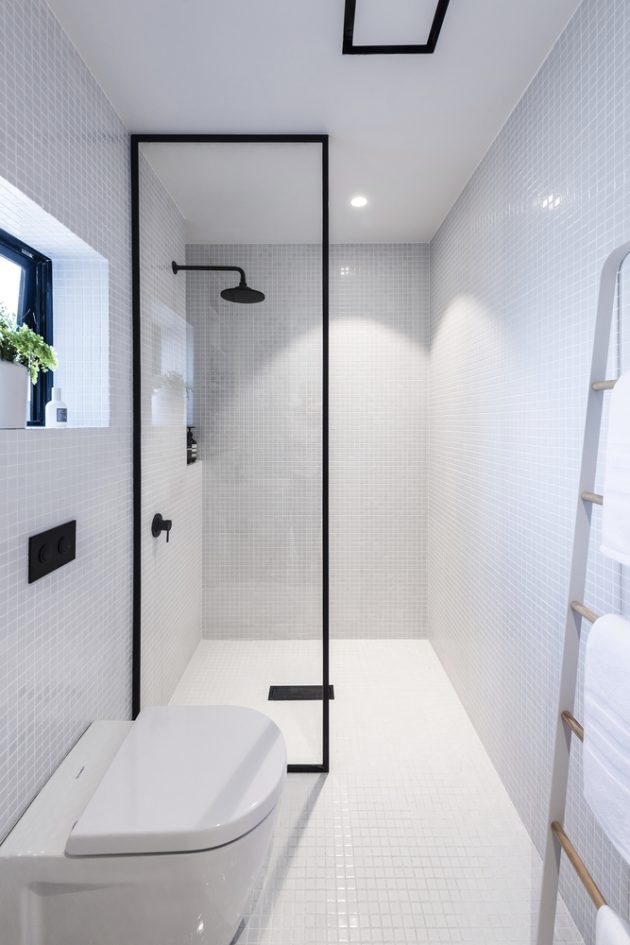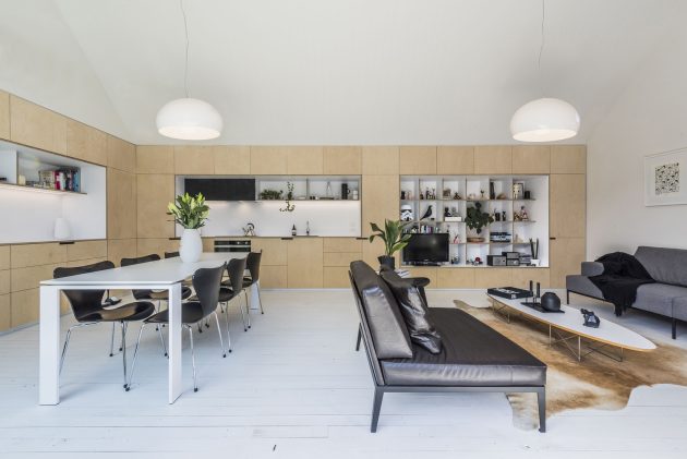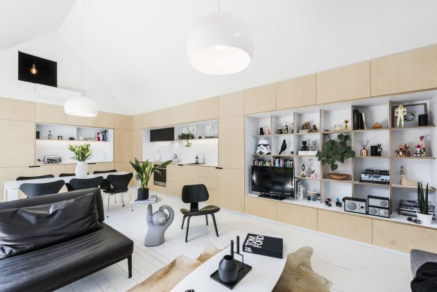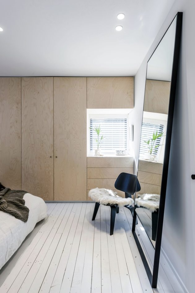 The dark black exterior is contrasted by a bright white interior, executed with absolute discipline to the monochromatic theme. Birch faced plywood is used in a natural state to face all joinery elements, which includes a space-saving storage partition between the living spaces and the main entry hall.