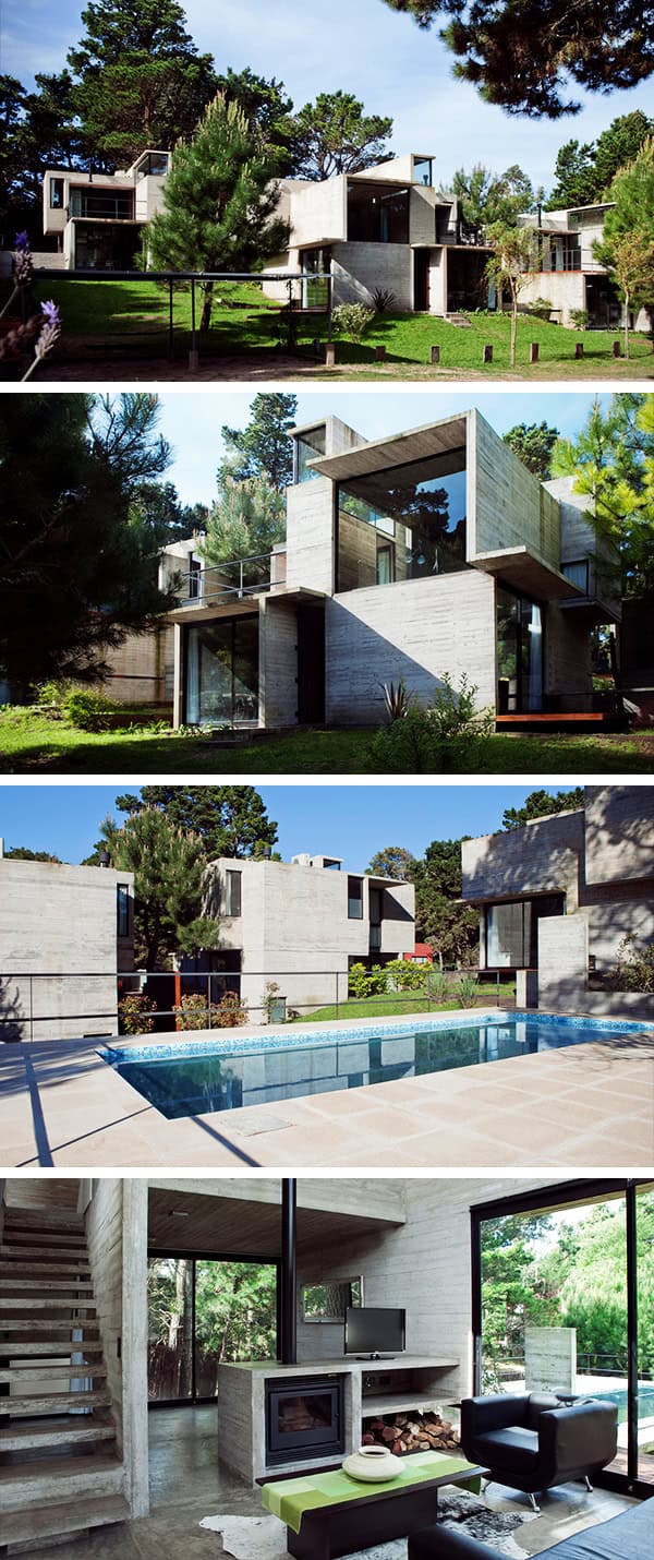 BAK Architects have designed the V + D Set of houses in a forested area in Mar Azul, Argentina. The exterior of this contemporary residence is characteristic of the architects’ style which we’ve already featured with their Levels House project. It is made of concrete and glass, each house isolated from another but connected with a communal pool area, a solarium and a storage area. The unique thing about the V + D Set is that concrete plays a major role even in the interior design.
