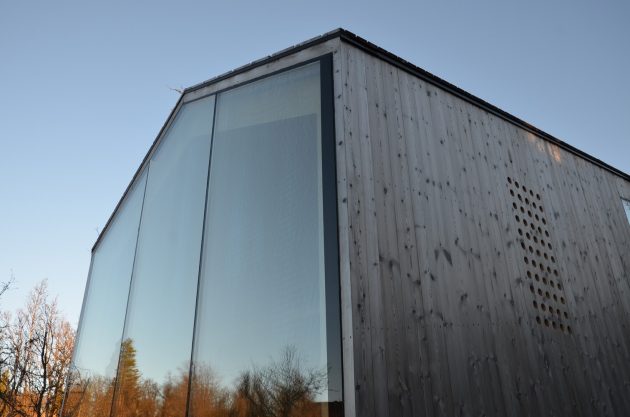 Floor-to-ceiling glazed openings throughout the cabin provide ample daylight and unobstructed views of the surrounding landscape. At the junction of the two wings, a glazed chamfered corner offers panoramic vistas and serves as a contemplative sitting niche. The design creates microclimate zones around the cabin, enhancing outdoor living opportunities and reinforcing the bond between the dwelling and its environment.