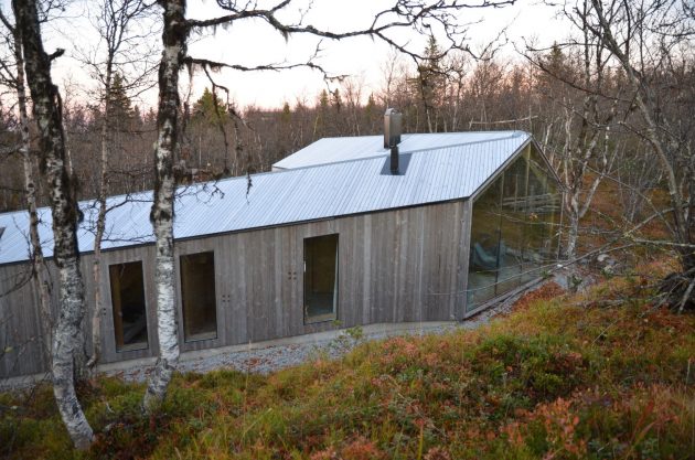 Clad in untreated, short-hauled pine, the exterior of the V-Lodge is designed to weather naturally, blending into the surrounding birch forest over time. Inside, walls and ceilings are lined with pine plywood, and a cast-in-situ concrete element combines the fireplace and kitchen counter. This minimalist material palette fosters a warm, cohesive interior that emphasizes craftsmanship and connection to nature.