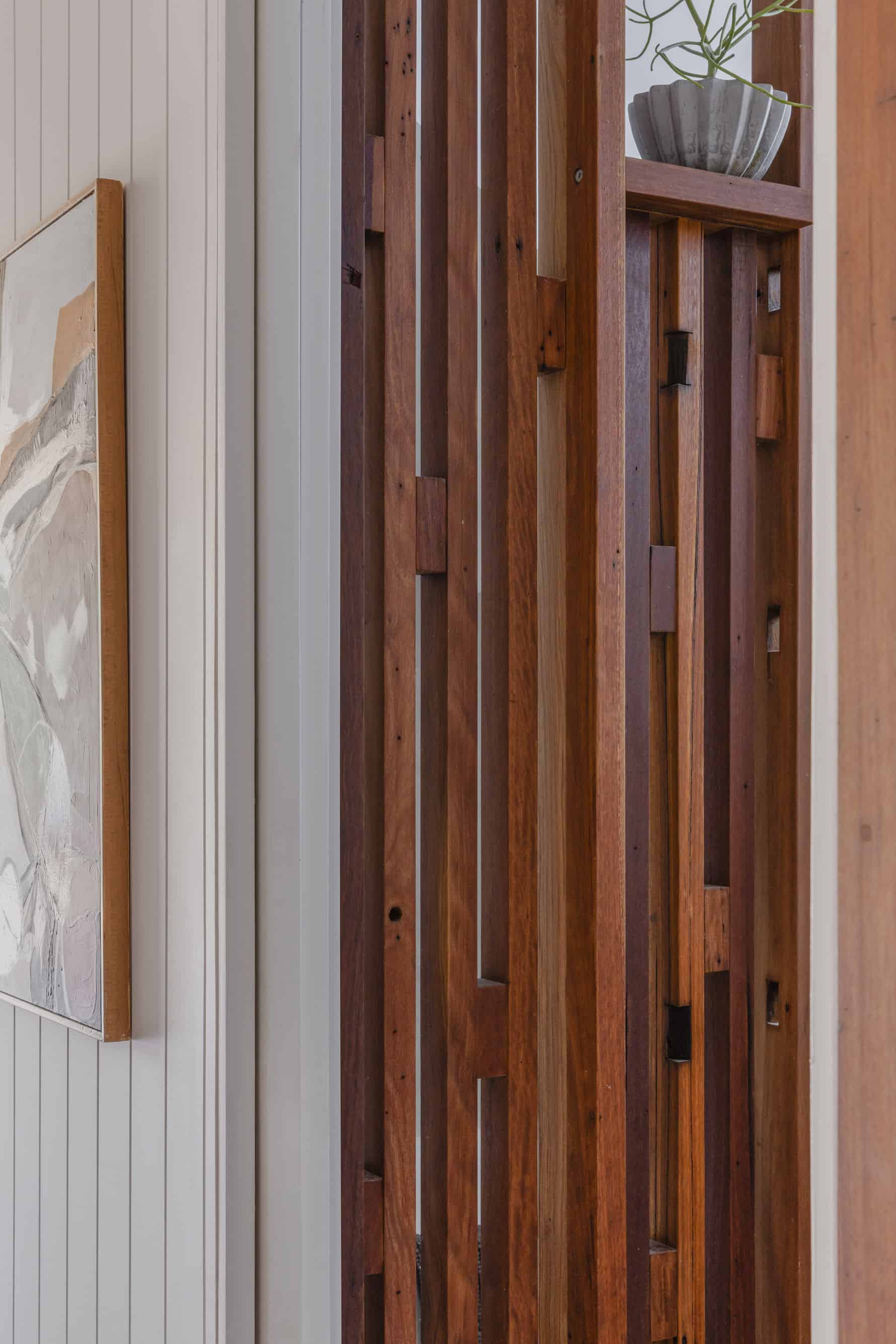 Sustainability is at the heart of every detail. Reclaimed hardwood from the demolished extension was repurposed into custom bathroom screens and joinery.