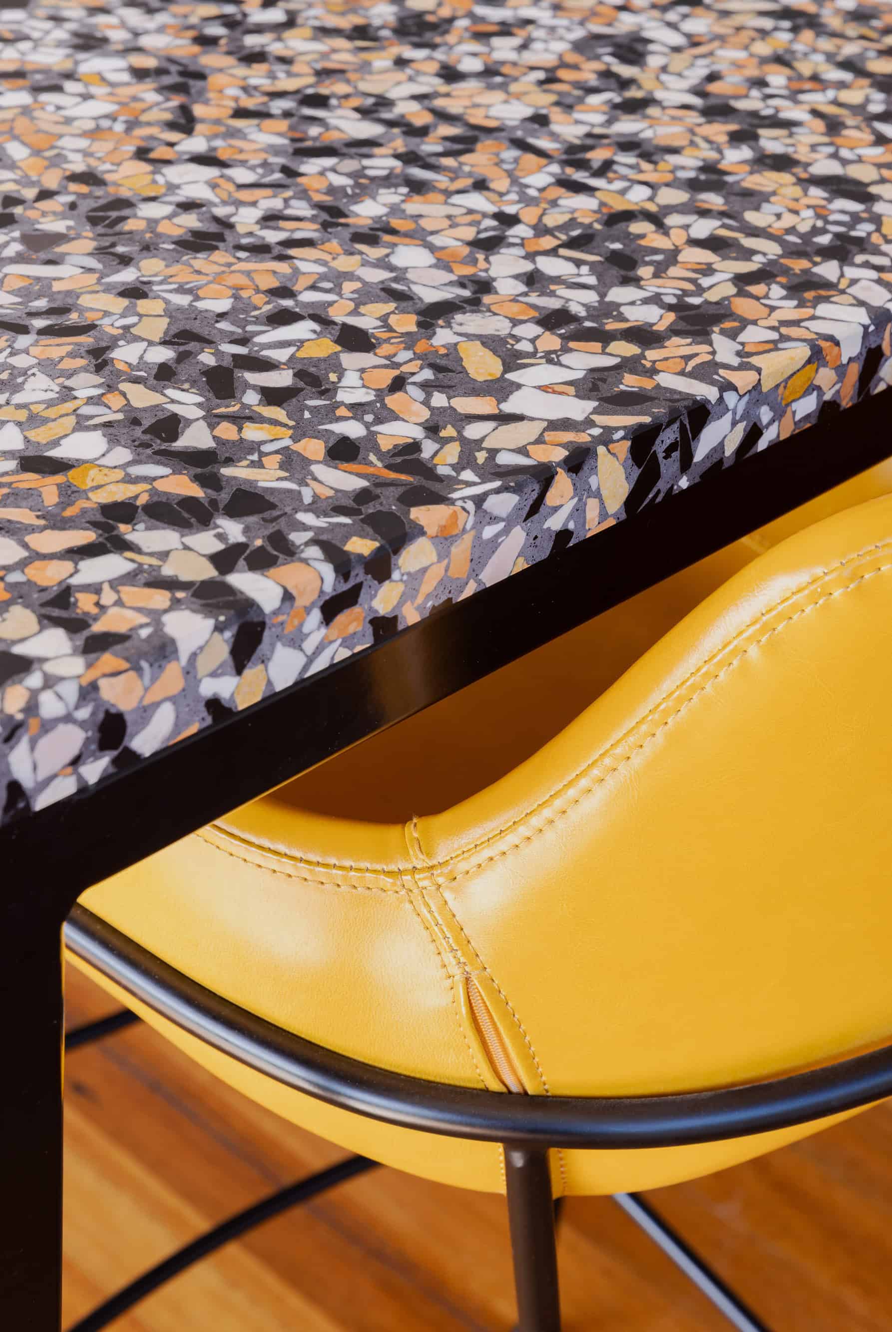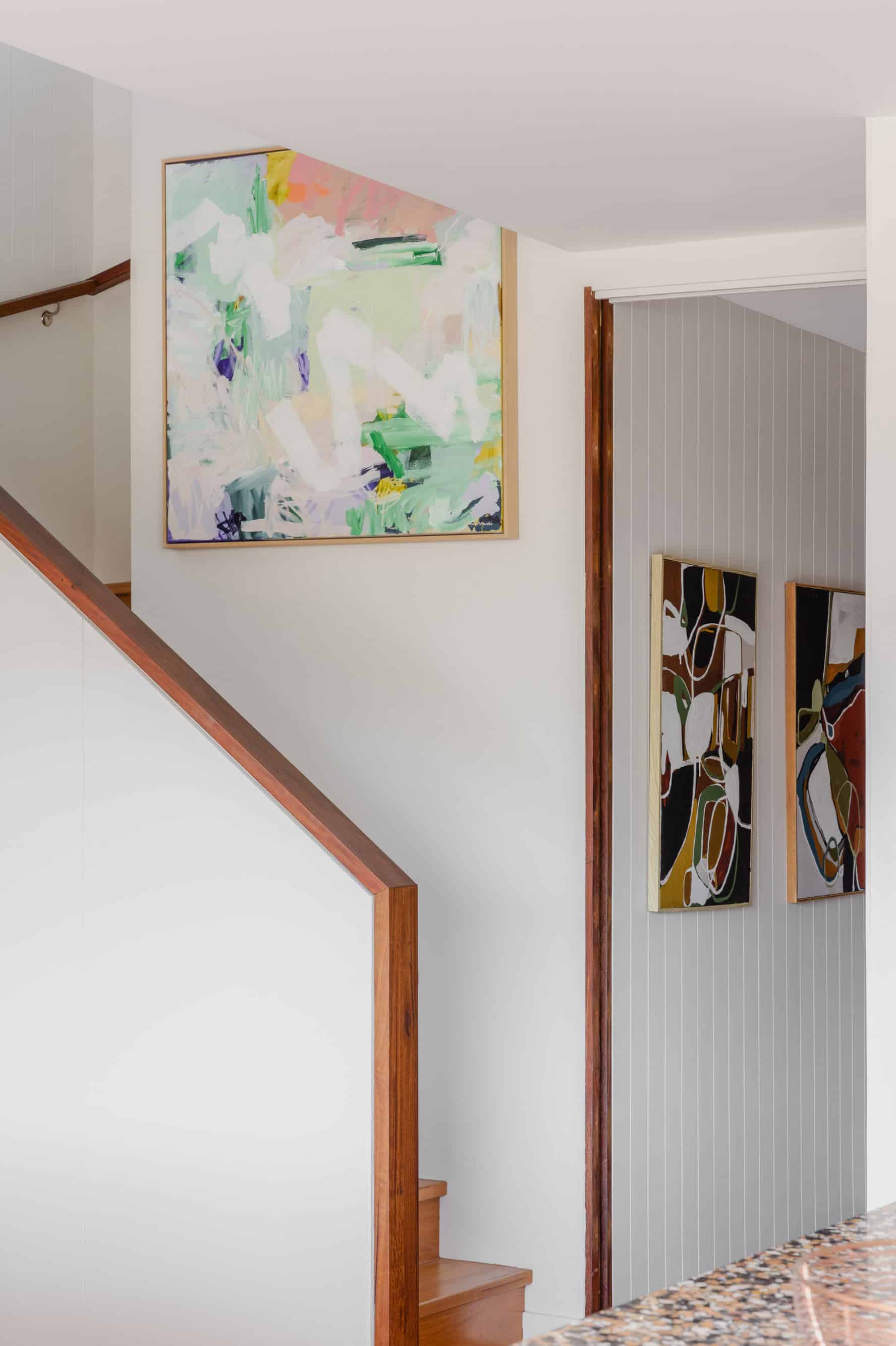 Original terrazzo countertops were salvaged and reimagined as bathroom vanities, supported by recycled steel bases. The new Blackbutt timber floors, also recycled, bring warmth and cohesion throughout the home.