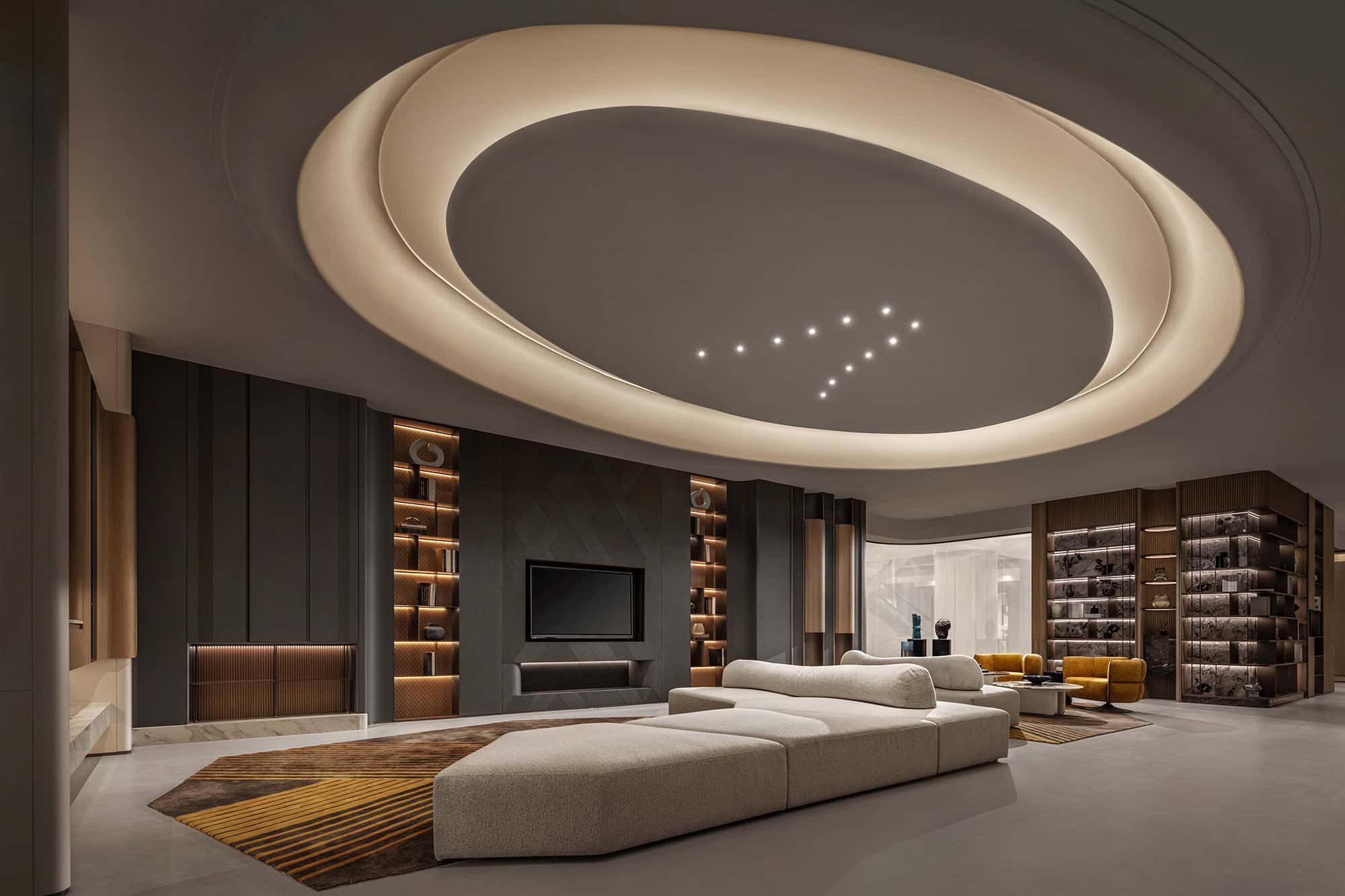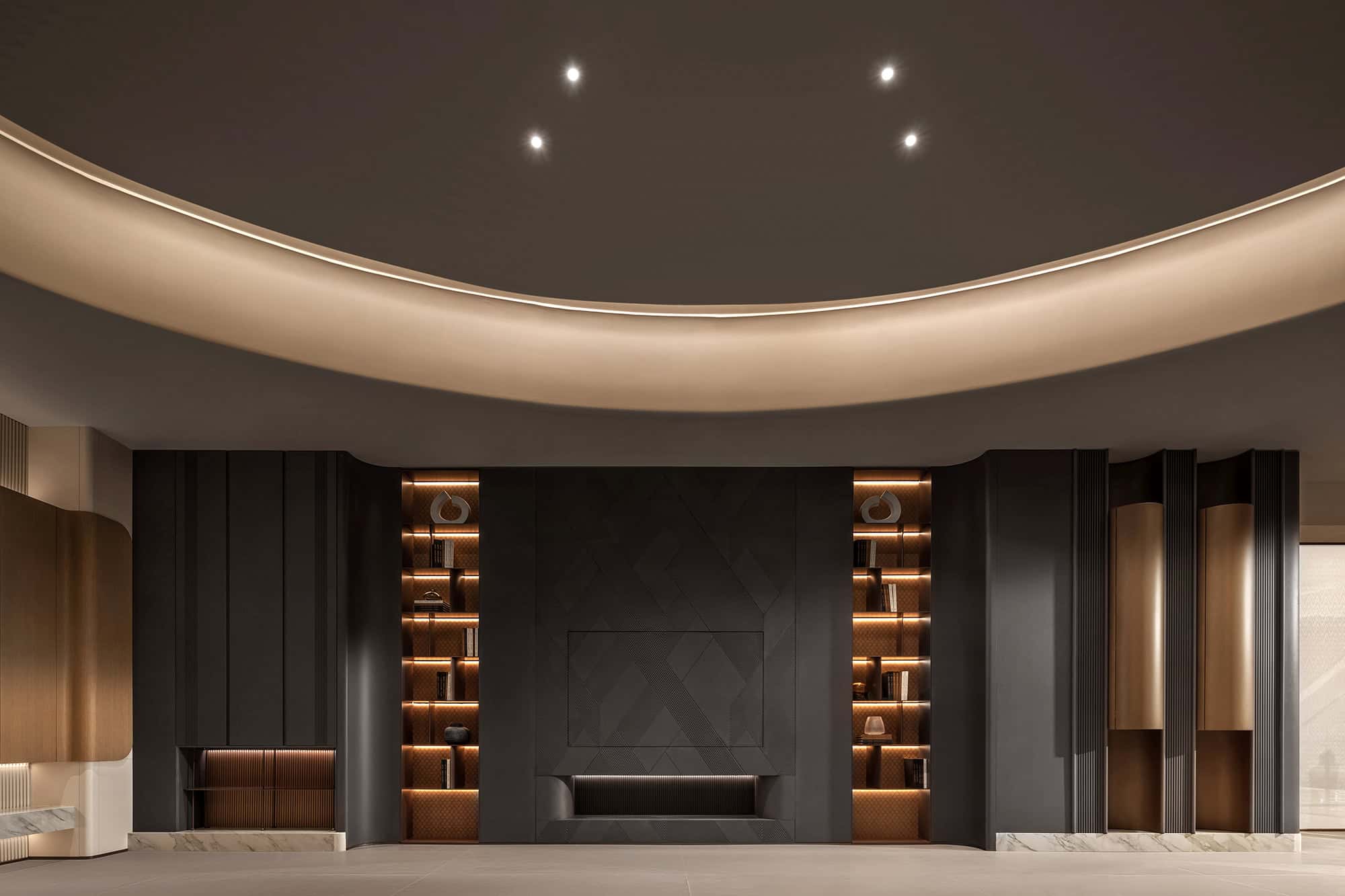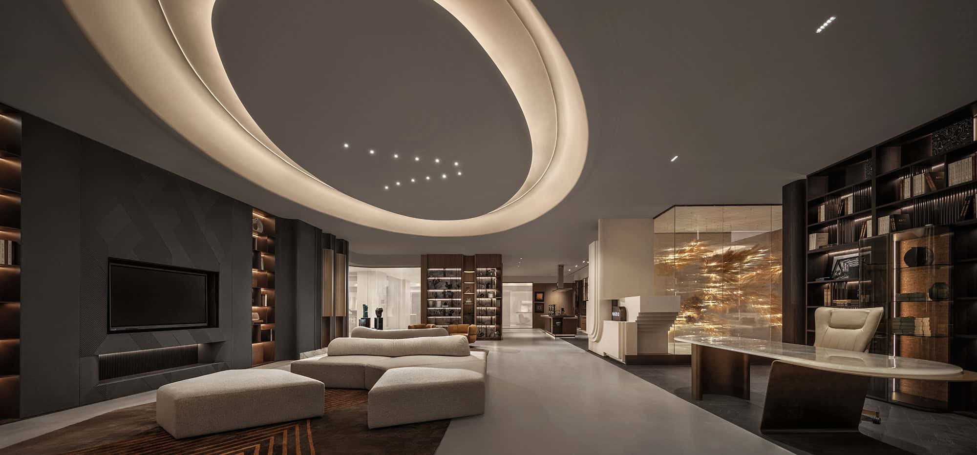 Zhuguang Lighting designed the lighting system to highlight every texture and curvature. Linear light strips trace the contours of the ceiling and furniture, emphasizing the sculptural rhythm of the interior. This interplay of light and shadow produces a constantly evolving visual experience — an essential part of the showroom’s narrative of discovery.