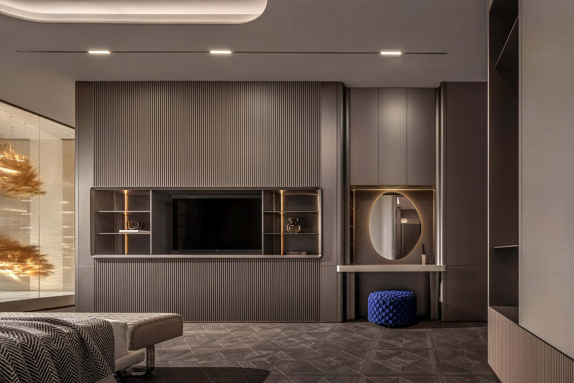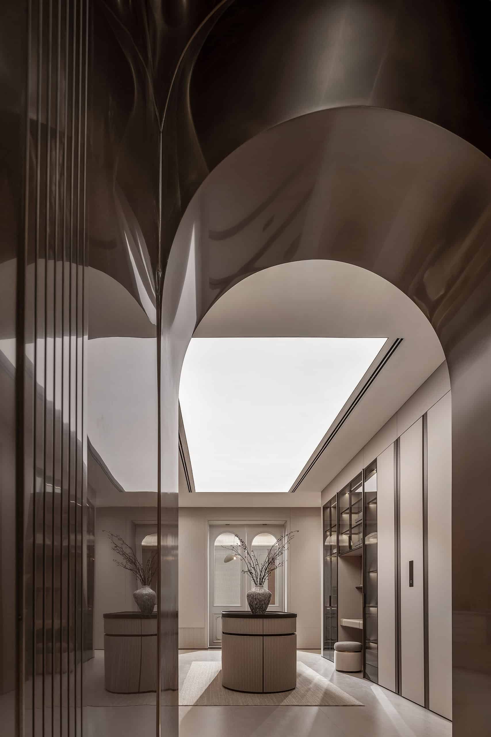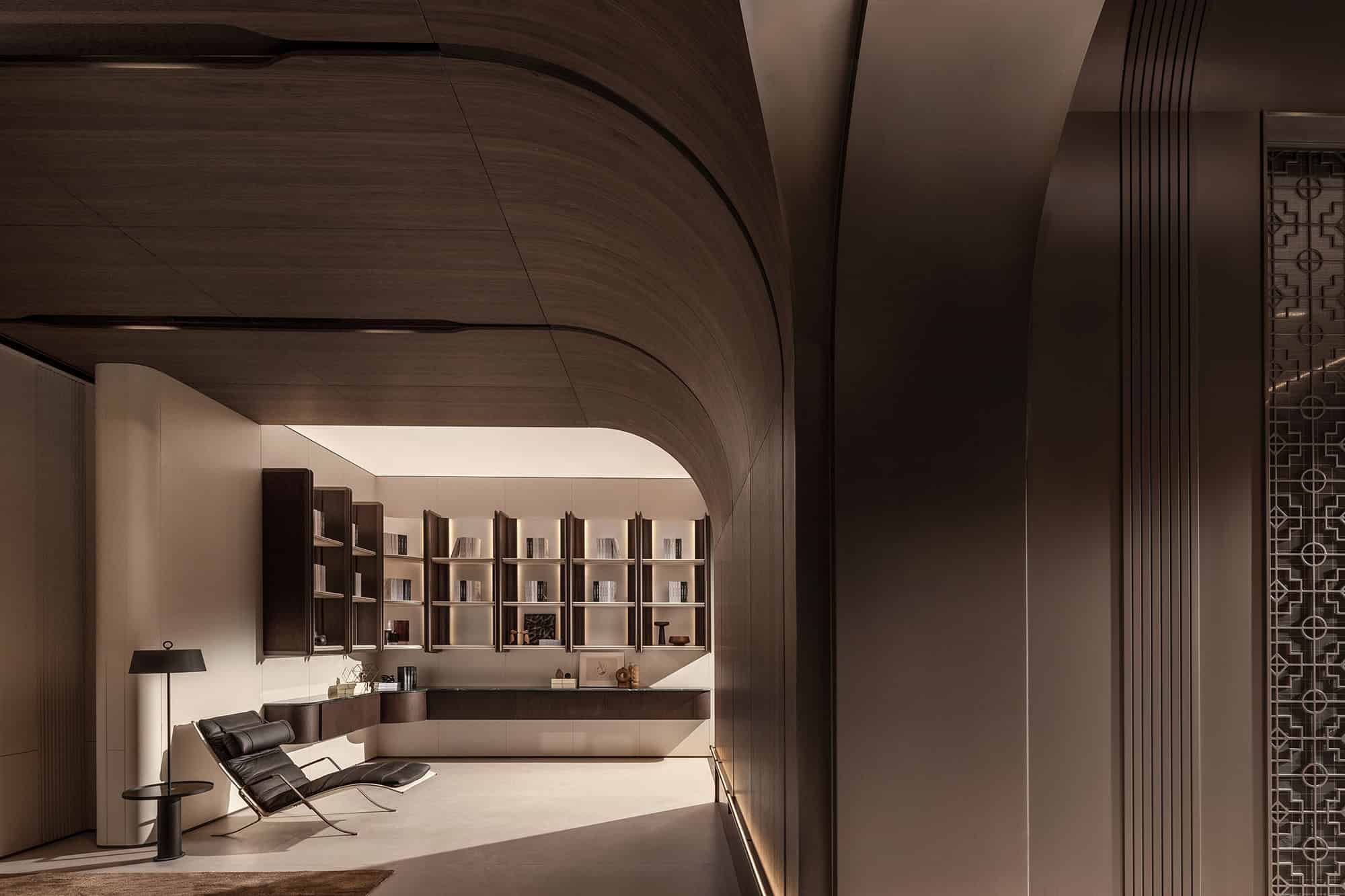 One of the flagship’s most distinctive features is its long, layered corridor, inspired by classical Chinese garden pathways. Acting as both a connector and a moment of pause, it links key spaces — the study, bedroom, and lounge — while revealing curated perspectives along the way.