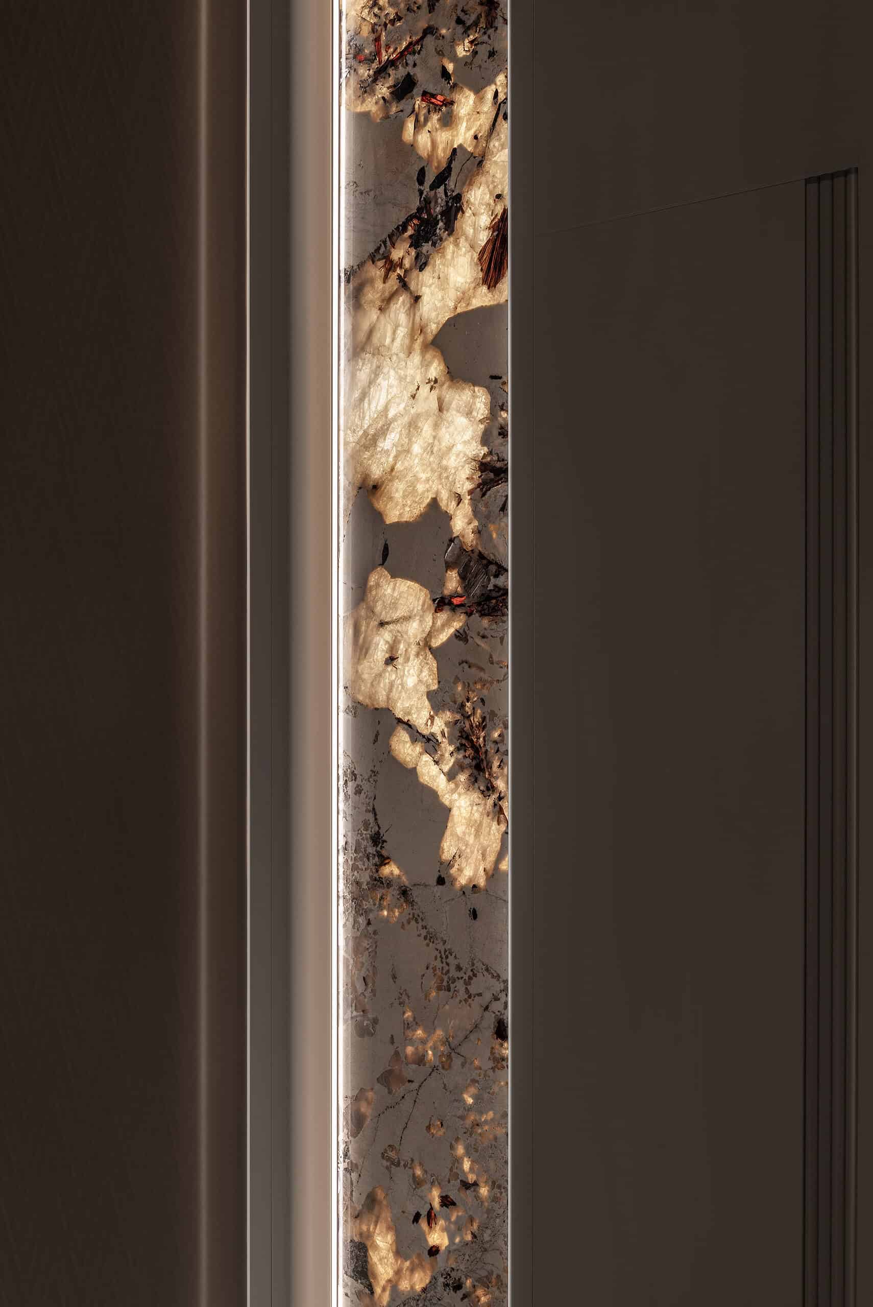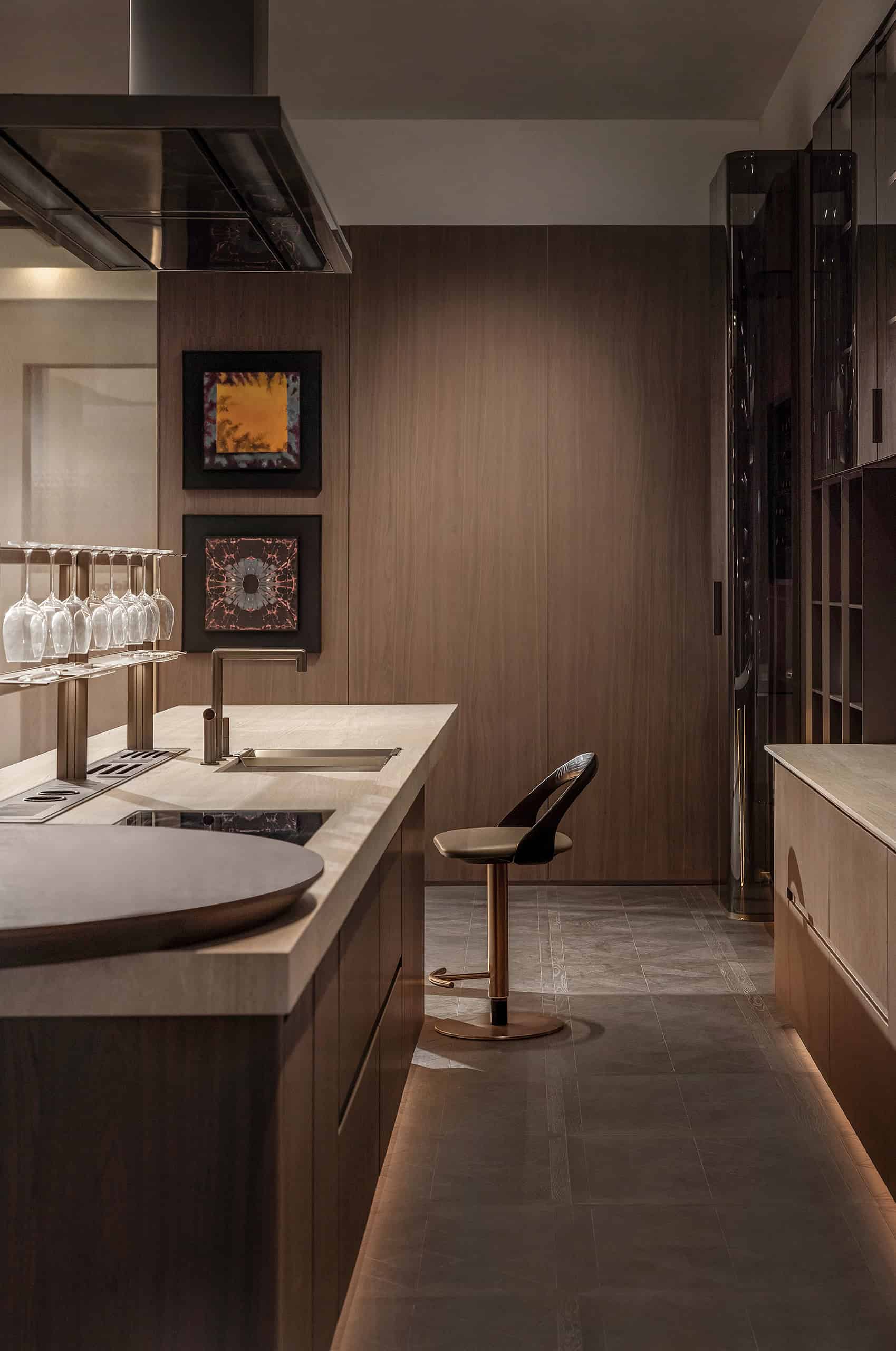 A Western-style kitchen anchors one of the central areas, featuring a custom island that subtly incorporates VARIO’s initial “V.” This detail reinforces brand identity while maintaining aesthetic coherence. The adjoining wine cellar — softly illuminated and finished in textured stone — exudes understated luxury.