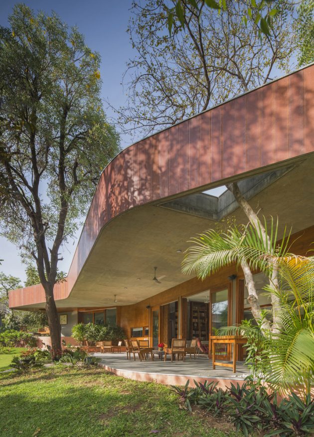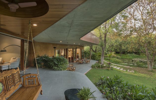 On the outskirts of Ahmedabad, India, surrounded by dense flora and a serene lily pond, stands Verandah House, a contemporary residence by Modo Design. Spanning 6,781 sq ft, this single-story dwelling reinterprets the image of a colonial ancestral home through fluid curvilinear forms, semi-open verandahs, and a seamless connection with nature.