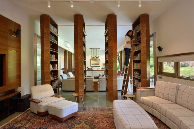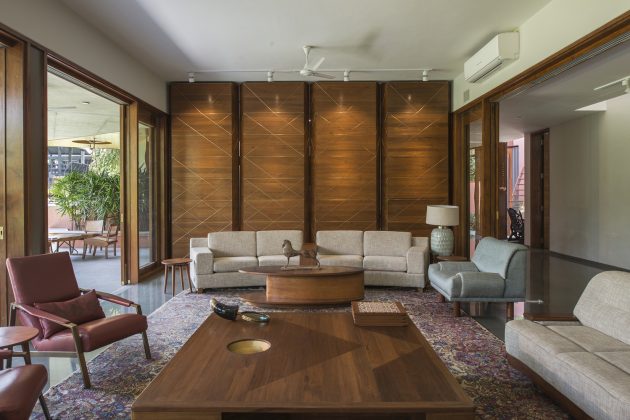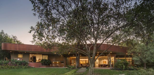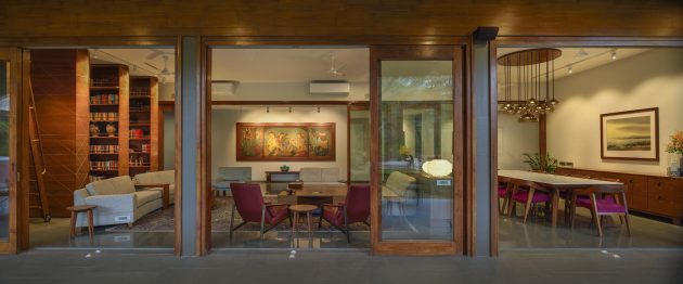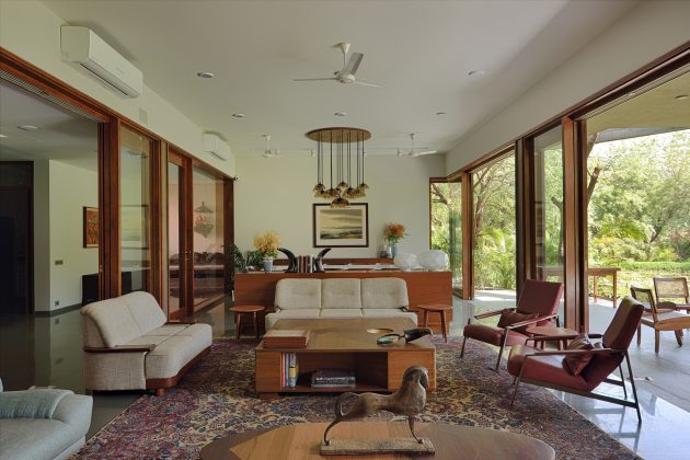 Built for the Munshaw family on a 4-acre estate, the house was envisioned as a permanent retreat away from the crowded city. The client’s brief was clear: avoid a box-like form, create a home that celebrates outdoor living, and design a container for a lifetime’s collection of artifacts, books, Persian rugs, and ancestral furniture.