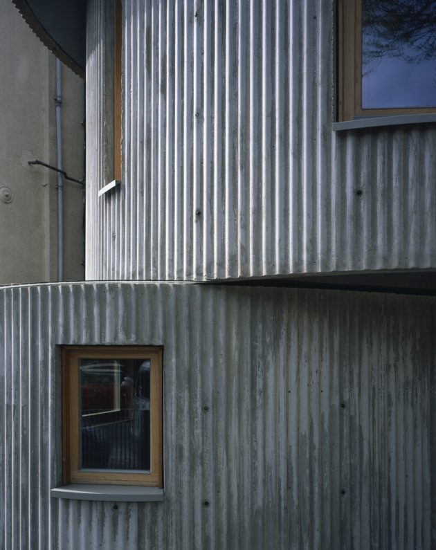 Wherever an upper floor is ‘pulled back’ from the one below a crescent-shaped rooflight results. Where an upper floor overlaps the one below, there is a reflective soffit of galvanised steel.