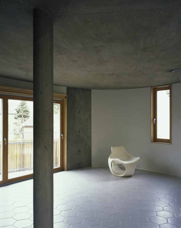 Internally, exposed concrete ceilings, elements of wall and a single elliptical column create a warm, cavelike feel – although the building is paradoxically very light with window positions responding to Satie’s musical score as well as contextual and sunlight parameters.