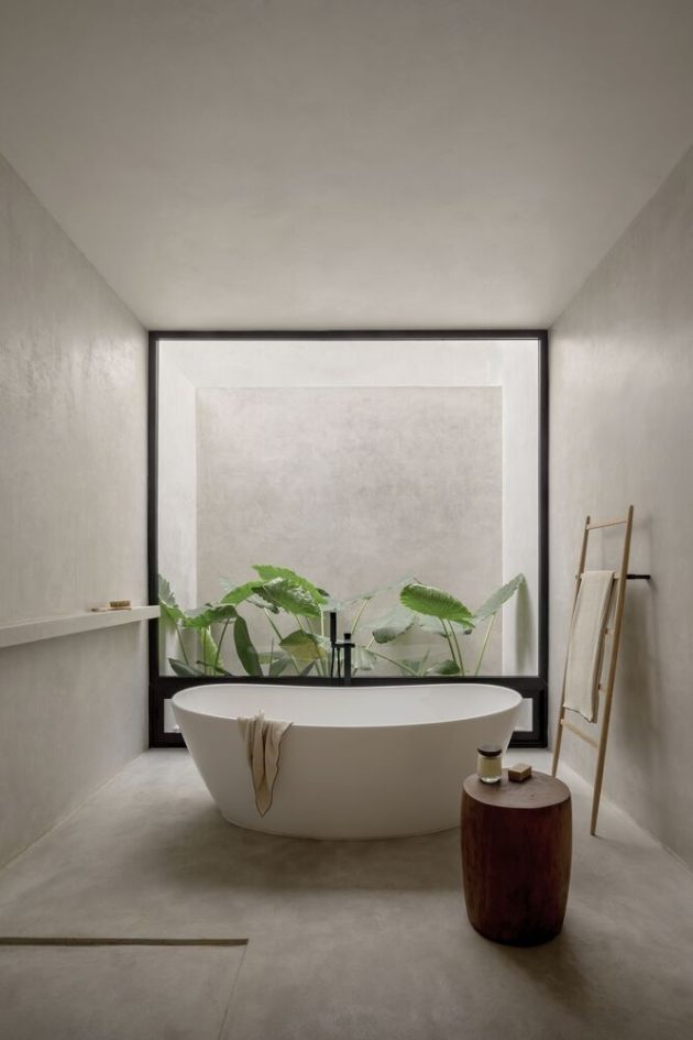 The ground floor accommodates shared functions—a study, open chef’s kitchen, expansive social zone—and opens directly onto a swim-up pool and terrace. The architecture uses changes in floor level and rhythm to heighten experience: one is gently compressed, then released, unveiling lush views and airy zones. Upstairs, the private quarters command lofty ceilings—one reaching 9 m—with a monumental 6 m × 6 m glazing unit that frames the jungle like a living painting. Meanwhile the rooftop offers a secluded seating terrace immersed in greenery.
