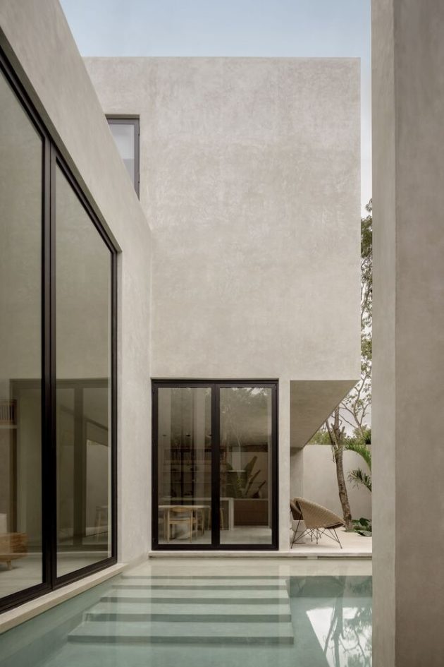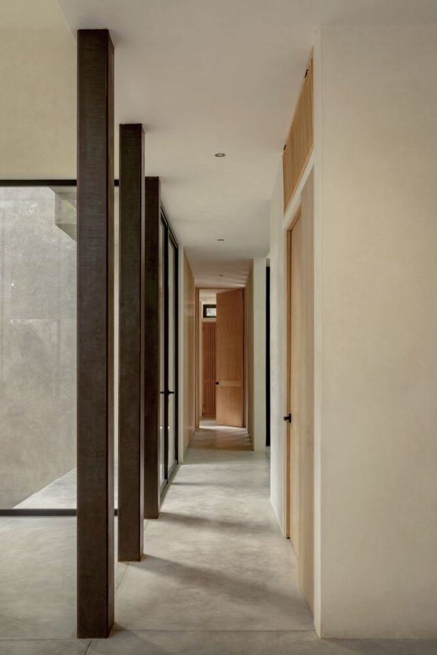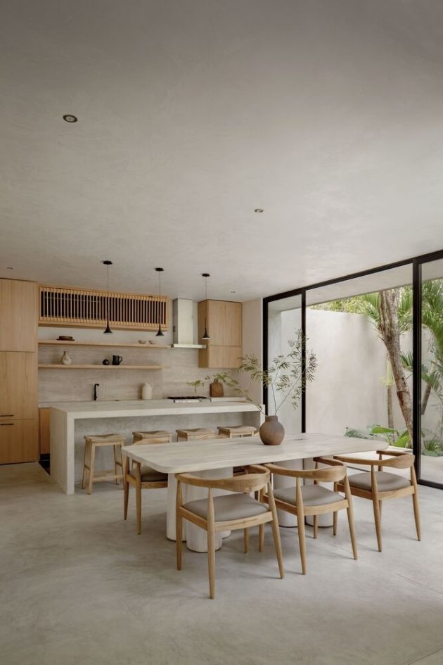 Inside, warmer tones of wood and soft finishes contrast with the raw concrete, introducing comfort and tactility. The integration of local materials and construction techniques reinforces authenticity: every brick, fixture and appliance was sourced from Mexico, giving the house a strong sense of place.