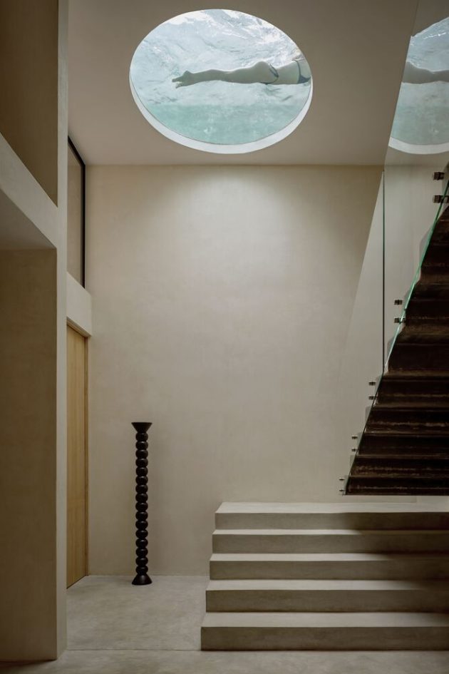 Villa Cava unfolds gradually, introducing the visitor to a sequence of spatial revelations. Access is via a dramatic concrete portal that frames two mature trees, anchoring the building to its site’s existing life. From here one passes into a lobby illuminated from above by a glass-bottom pool—an overhead water plane that filters daylight as though one were beneath water.