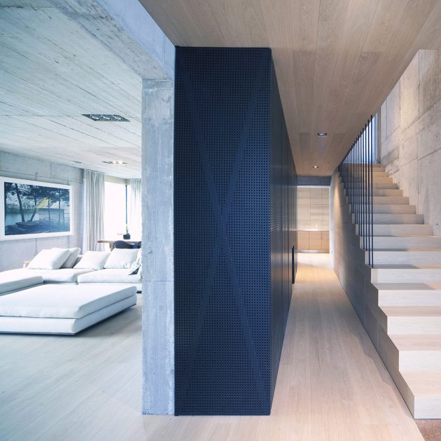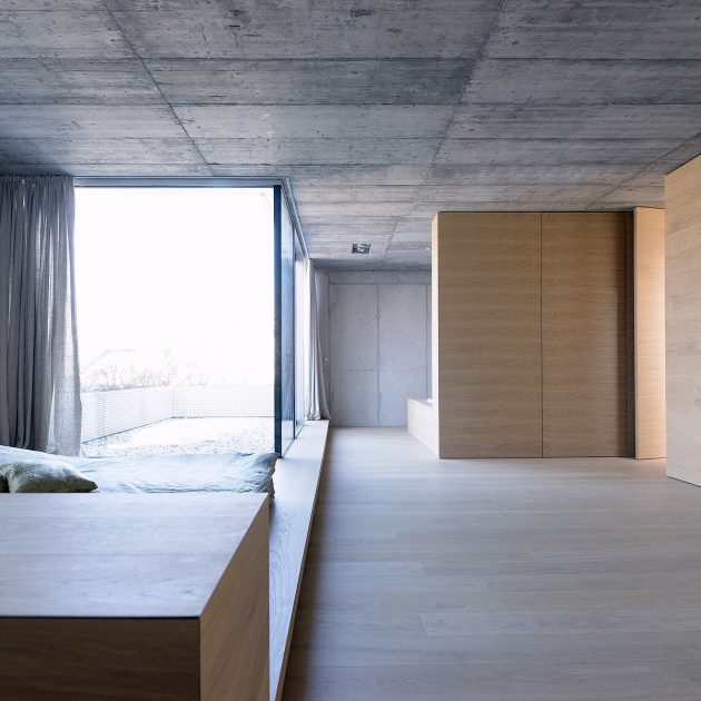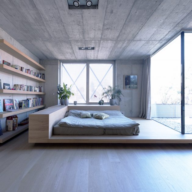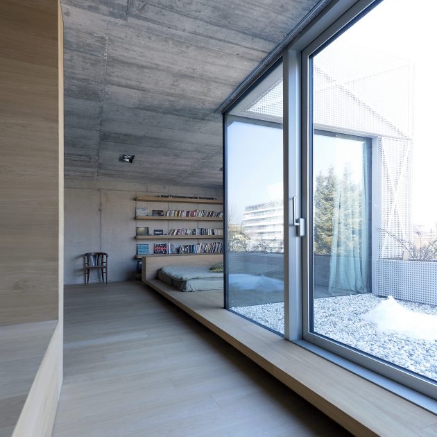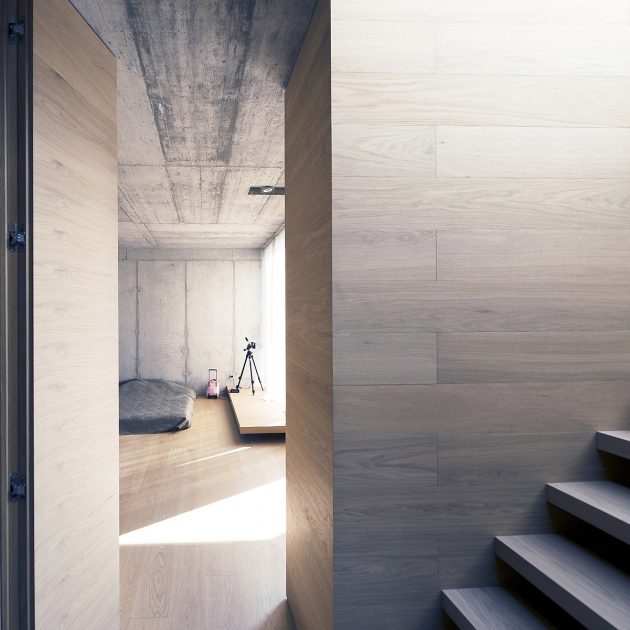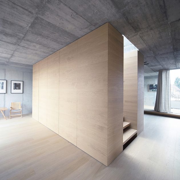 “The internal volume embodies two elements: exposed structural concrete walls and a wooden shell. The project required a residence for a single family with three children. The brief was to maximize living area with minimum of the service space. The concept divides space based on distinct program by separating function not by walls but floor levels: ground floor is living/communal space, first floor is children area and second floor parents area. With no cellar, the shell is integral to provide all of the space for storage. The flush walls fold out to house cupboards, shelves and drawers throughout the living areas and furniture such as beds, seating and counters are built into the floor in order to optimize space and provide easy maintenance. This connects different spaces in the house by giving a common function to partitions.”