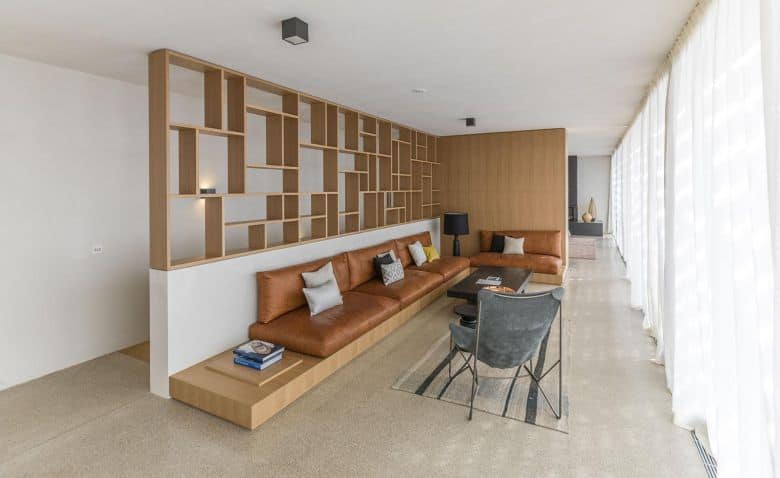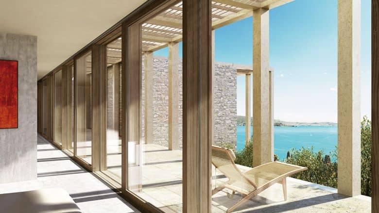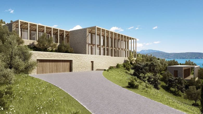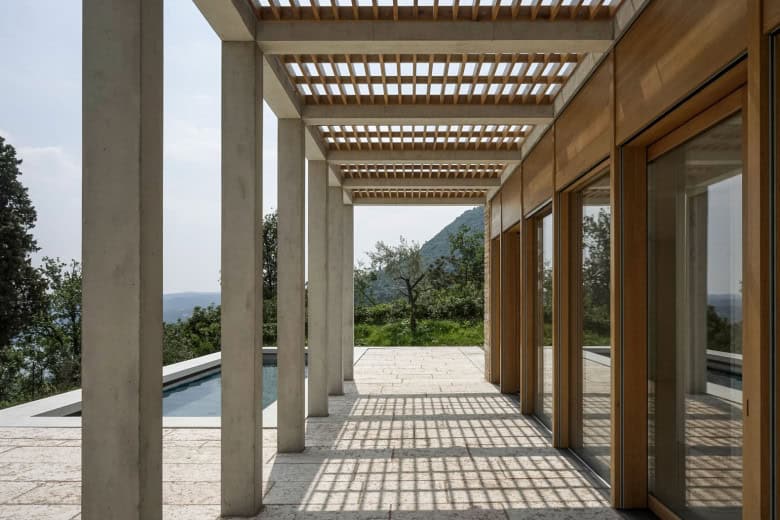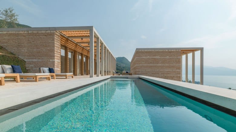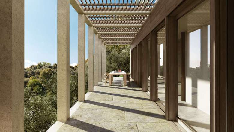 The typology of the villas interprets the architecture of the limonaias, which were built for the cultivation of lemons and are historically typical for the area. These buildings characterised the western shore of Lake Garda with their pergola-like structures up until the end of the nineteenth century. With reference to the limonaias, the building volumes are each framed by three solid exterior walls made of natural stone masonry and built up on a plinth of the same material. The main elevation facing the valley opens up towards the Mediterranean landscape with room-height windows. Pergolas with slim columns are placed in front of the volumes, echoing the rhythm of the surrounding olive groves. The pergolas provide protection from the sun and extend the interior into a protected outdoor space, which leads to further terraces with outdoor pools.