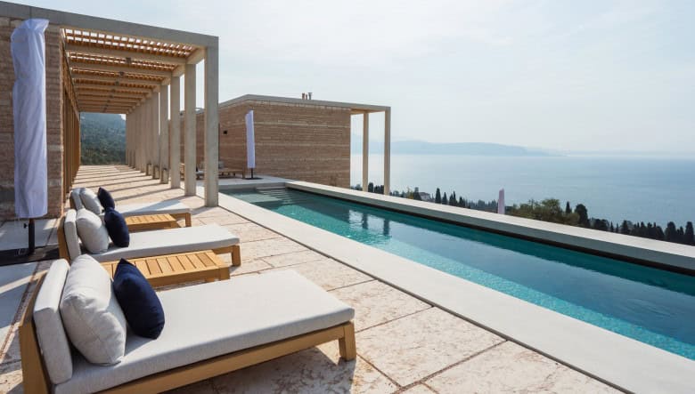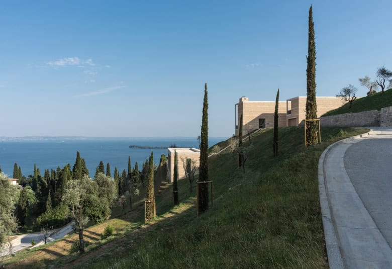 Villa Eden is a superb villa that is a part of a luxury resort on the coast of Lake Garda in Gardone, Italy. It was designed by David Chipperfield Architects to blend in with the grass covered terraces, olive groves and cypress trees that surround the lot.