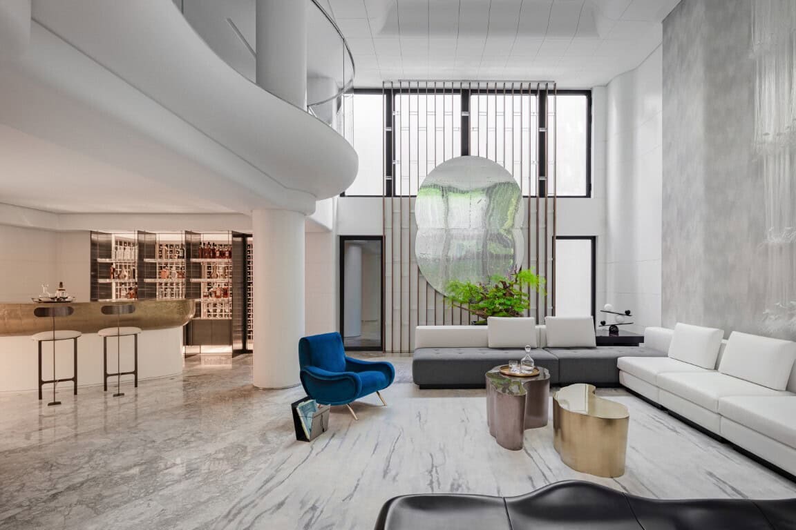 Through design renovation, two sunken courtyards were created, lighting up the two-floor underground space. In the private gallery on the 1st basement level, the stone-shaped chairs made of brass are opposite the mountain-shaped sofa and wallpaper, composing a three-dimensional landscape painting together with the display cabinets.