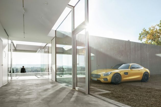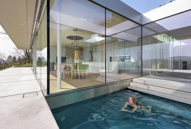 The sustainable house is placed facing south in consideration of the amazing views as well as the path of sunlight to maximize efficiency. A glass façade, stretching from roof to floor, demarcates the living areas. The glass façade, without any disruptions such as windows or outdoor sun blinds, reflects nothing but the air and offers amazing views over the valley. Around the living area a U-shaped terrace is constructed. A pool intersects the interior of the house while extending towards the southern edge, which makes it seem to float above the hill.