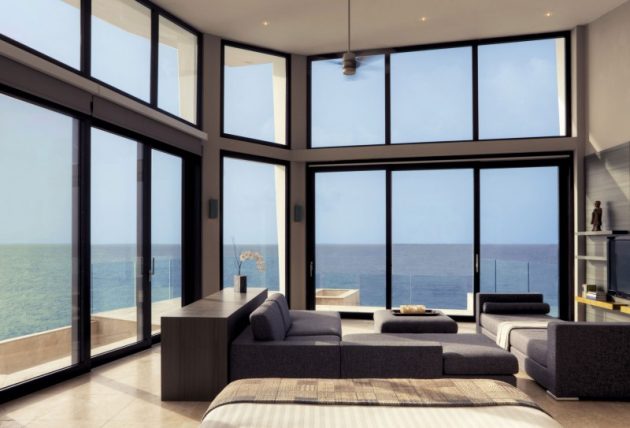 Modern luxury beachfront house with infinity pool and ocean view, featuring contemporary architecture, large glass windows, and outdoor lounging area.