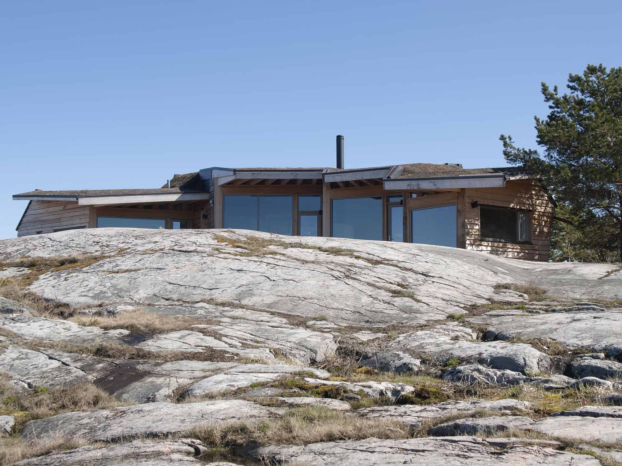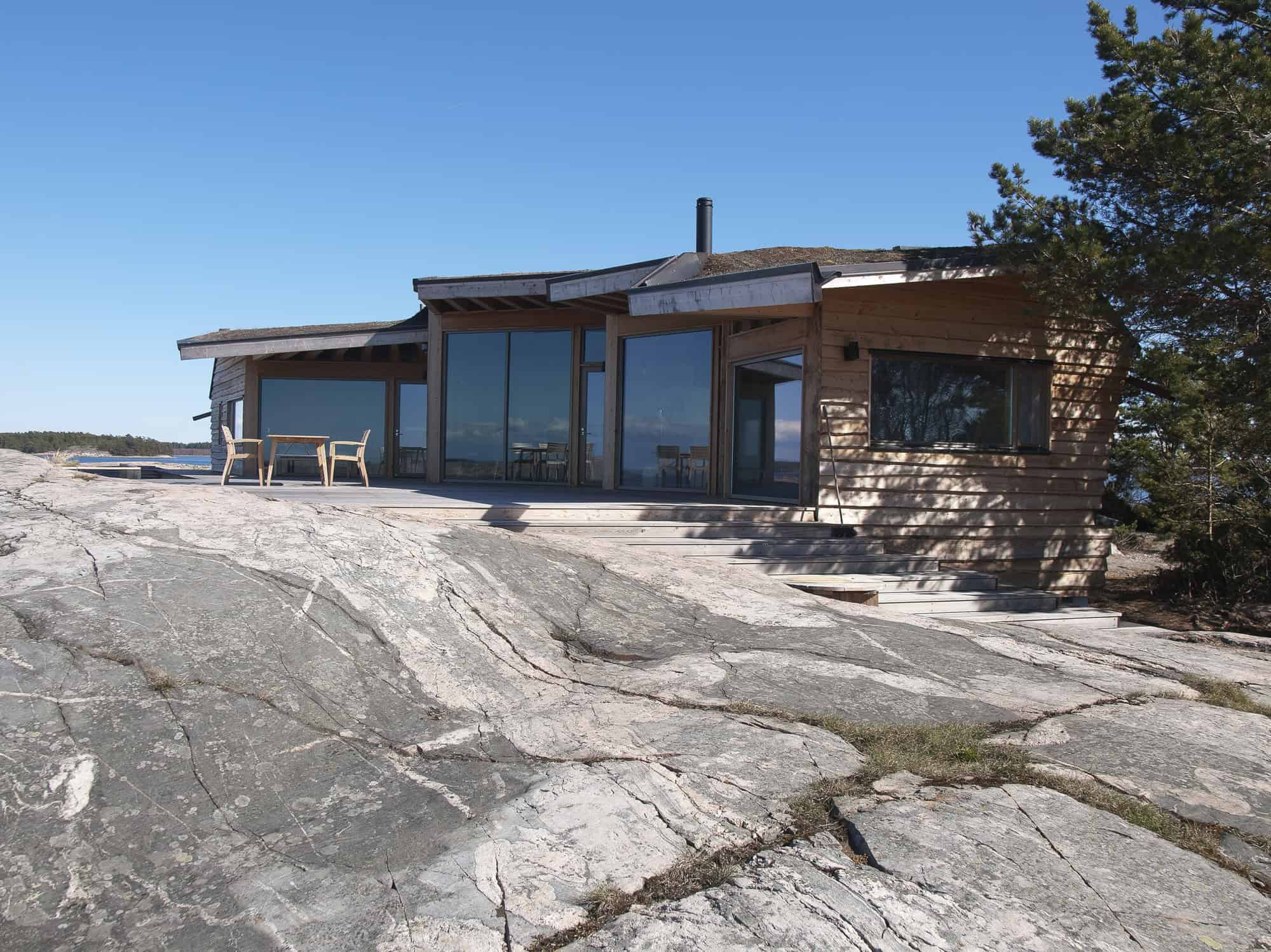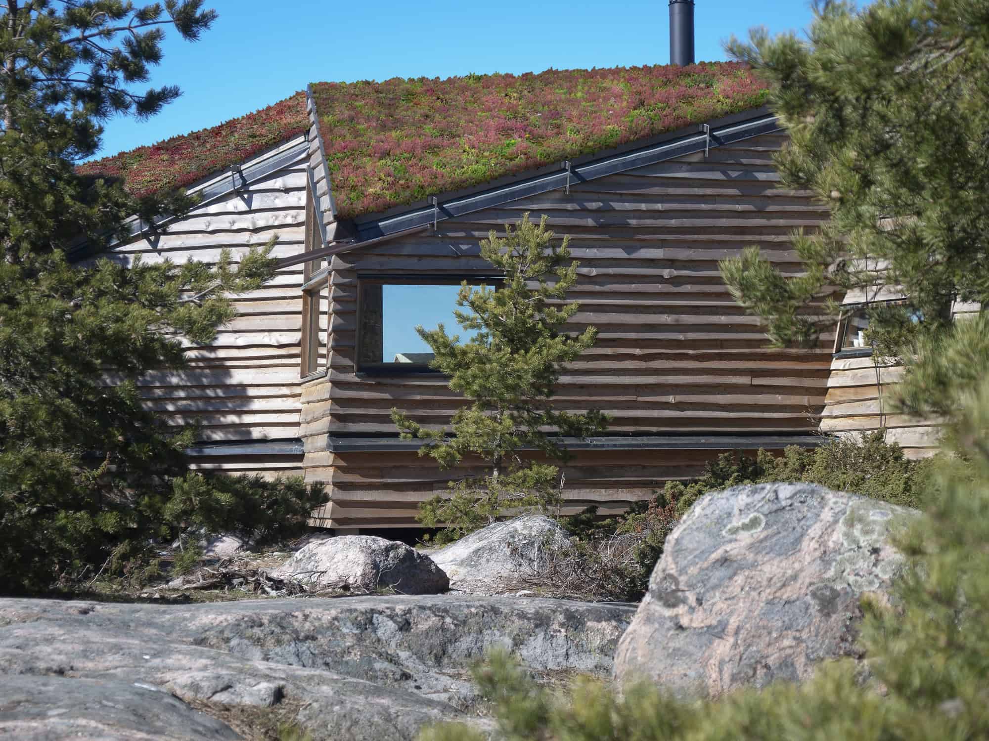 The geometry of the building relates to the forms of the granite bedrock with its varied colours and glaciated grooves. Larch, which naturally weathers silvery grey, clads the exterior, while sedum changes from green to brown on the roof during the summer.