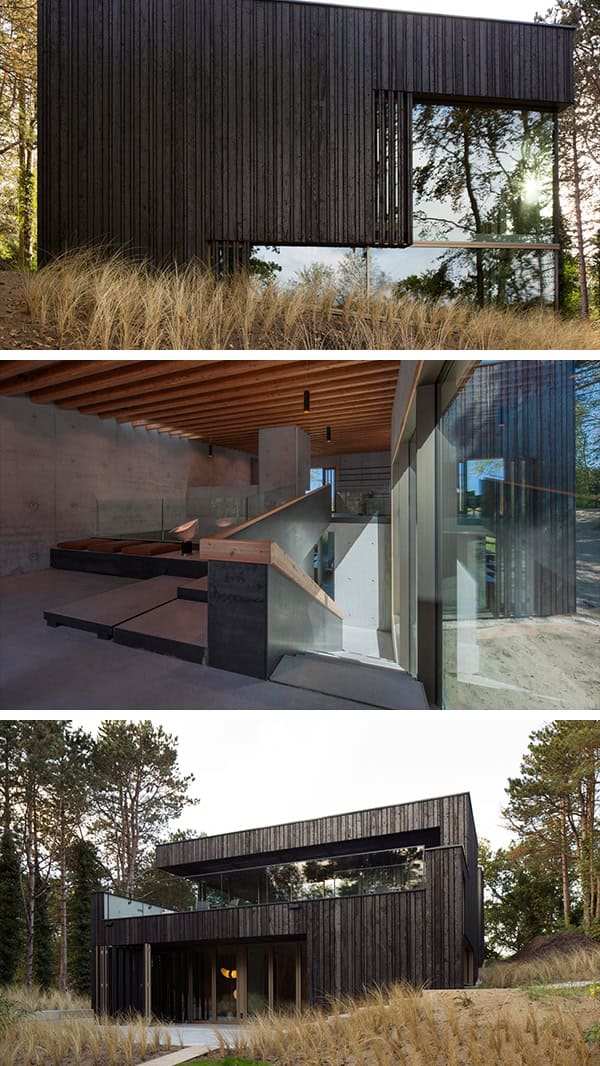 The boxy geometric structure is entirely clad in charred timber, creating a textured black surface that appears different depending on how sunlight falls on it. The exterior finish, inspired by the ancient Japanese shou sugi ban technique, also helps to preserve the wood.”