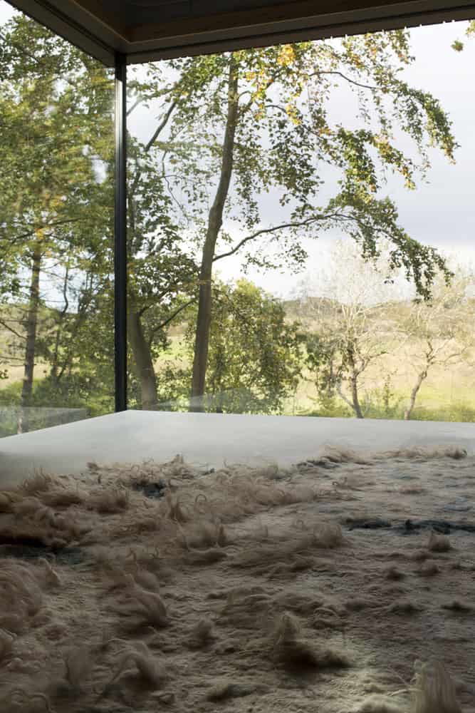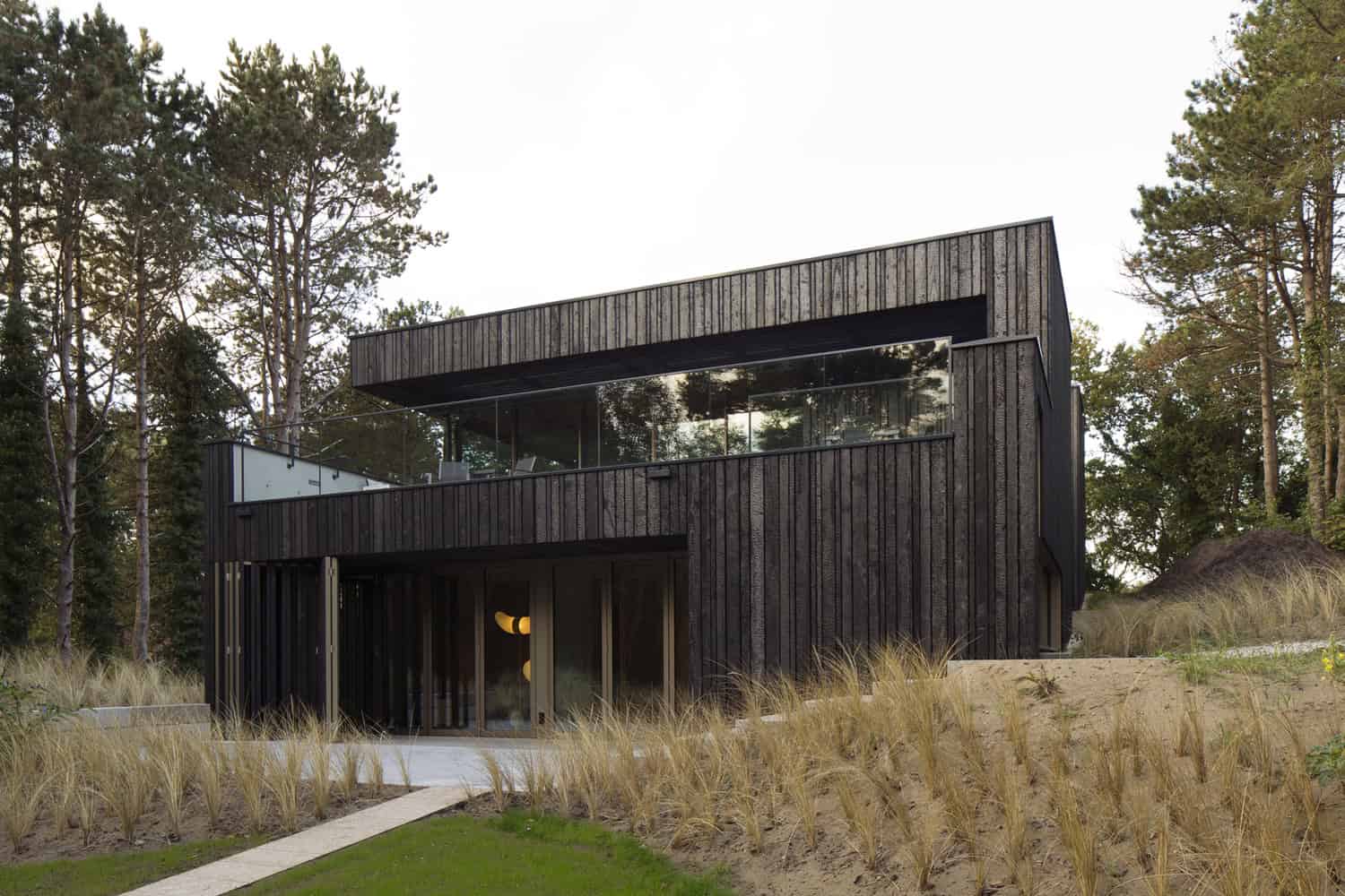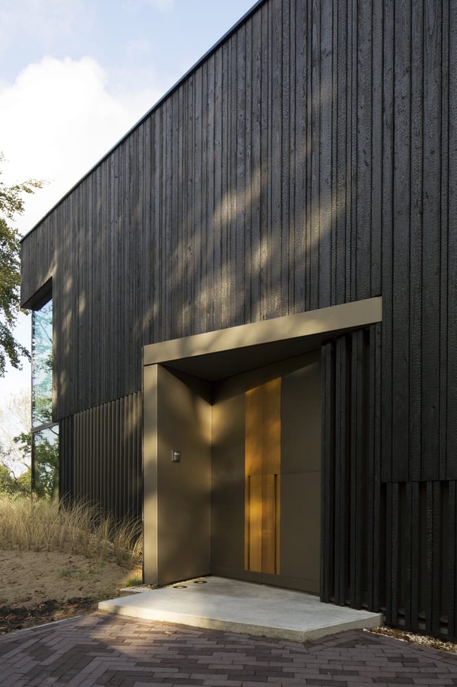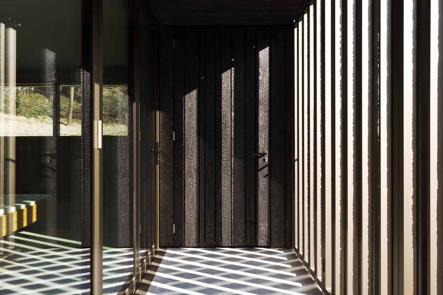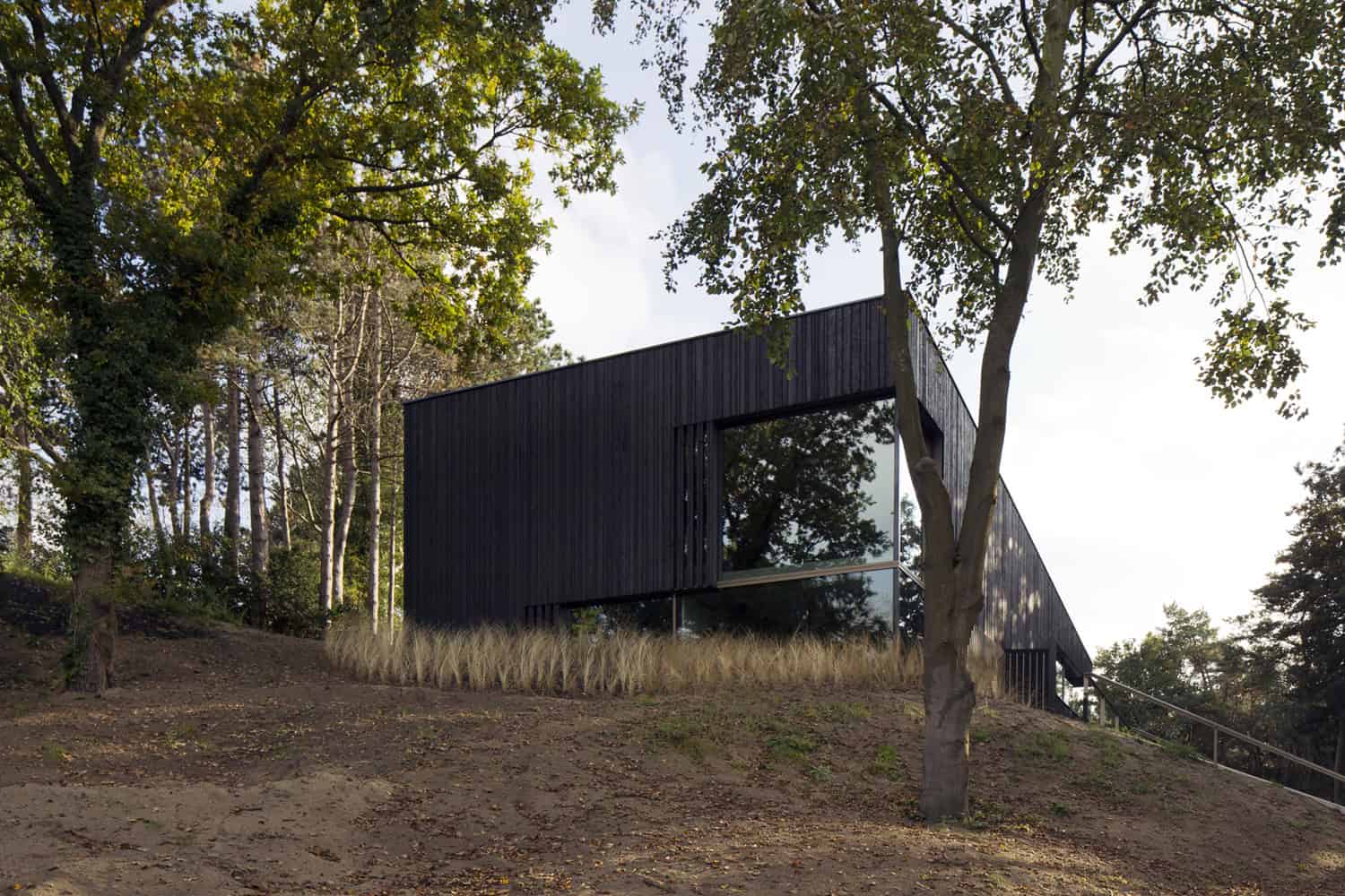 “Sometimes the house is almost invisible against the dark edge of the forest, sometimes it sparkles in the sunlight because of the glittering charred wood, as such forming a background for the play of shadows of tree trunks and branches. The villa hides and reveals itself in the landscape.