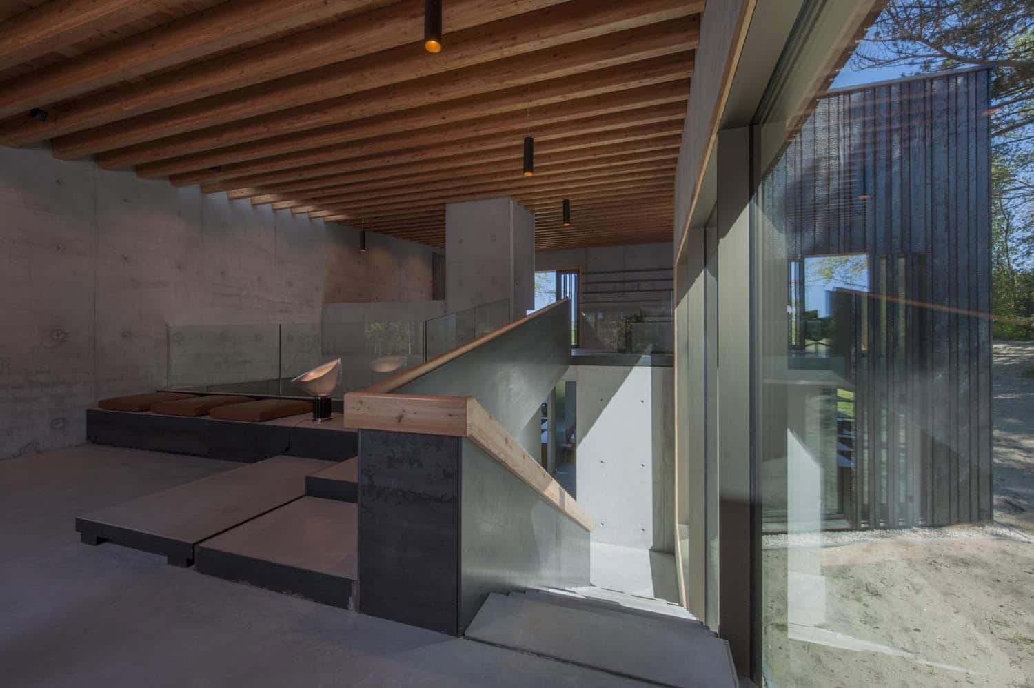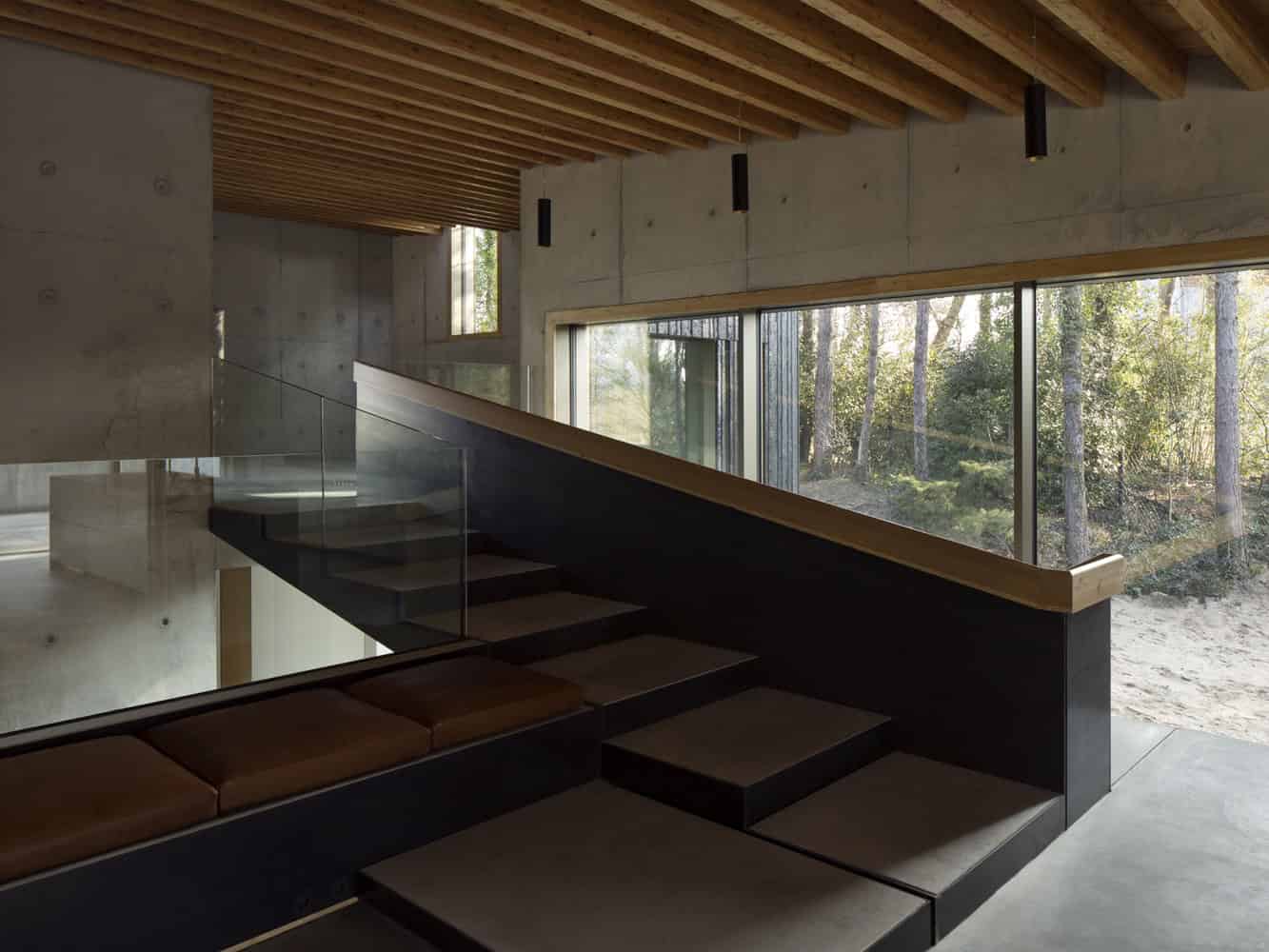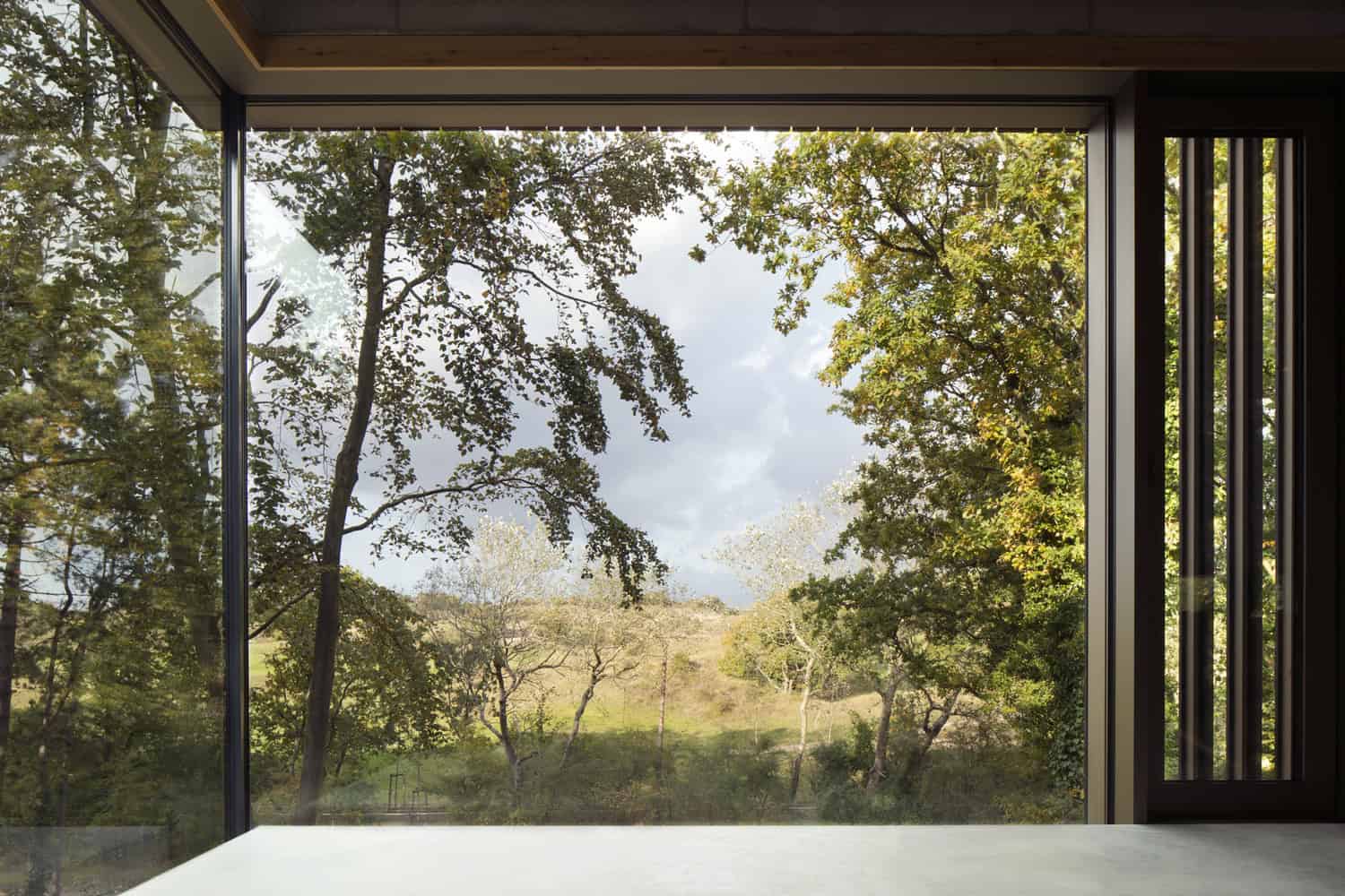 “The living room features a full-height corner window that looks out through the trees towards the dune valley. A lower window facing to the rear and a large glazed surface lining the adjacent double-height circulation area face out onto the forest. At the far end of the first floor, sliding glass doors lead out from the kitchen onto a terrace.