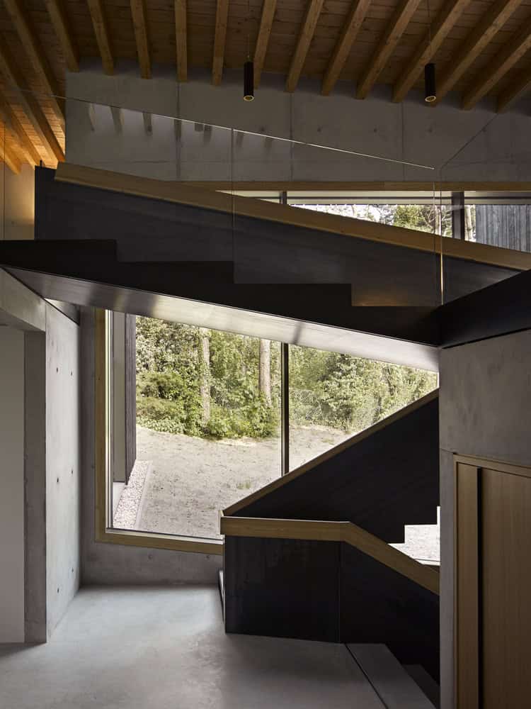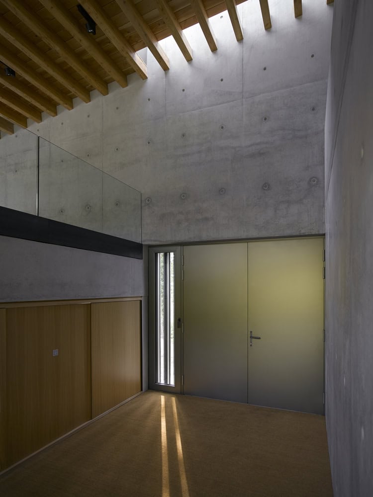 The material palette –concrete, steel and anodised aluminium– was chosen to complement the tones and textures of the surrounding environment. Each material is applied in a raw, untreated form. Internally, the walls are finished with smooth concrete, while the rough-sawn Douglas fir beams supporting the ceilings feature a distinctive grain.”