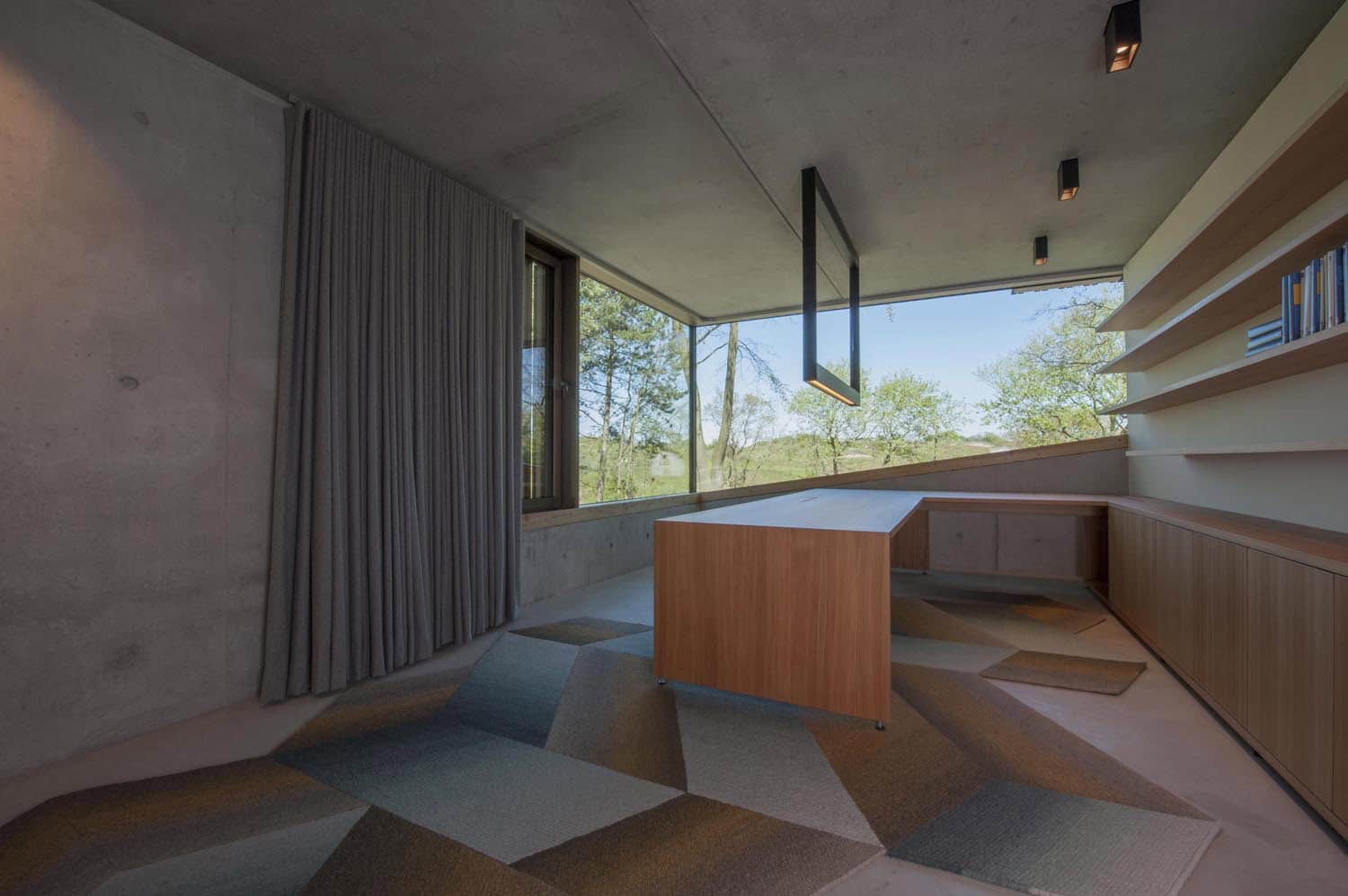From the architects: “Villa Meijendel takes its name from the nature reserve in which it is located, where a forest meets a valley of dunes. The house is constructed from concrete and set into the side of a sandy slope. The building’s design aims to create a dialogue with its surroundings, both through the way the form and materials engage with the landscape, and through the use of glass to provide views out from and into the house.