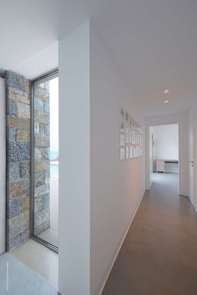 The interiors are minimalist, with a color palette in white and gray, inspiring space and neatness. With a spectacular contrast between the white ceiling beams and the stone walls, the open-plan kitchen and dining area is the design highlight of the house.