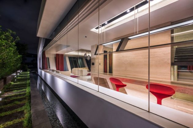 Designed by Mercurio Design Lab, Villa Mistral is located on the island of Sentosa in Singapore. The luxury villa is named after the seasonal strong wind that blows across the Mediterranean. It looks like an elegant cruise ship thanks to its metallic white facade and its structural elements that are expressed both internally and externally with references to a boat. The exterior communicates a sense of a forward thrust.