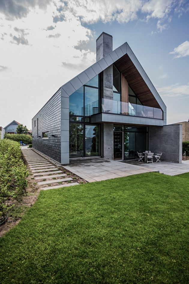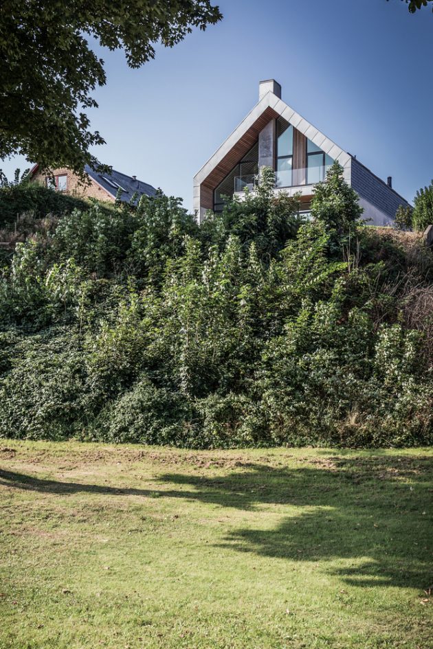 The villa’s name stems from its form: the bearing outer wall folds where the steep roofline meets the horizontal floor, creating a profile that resembles the letter “P.” This structural fold is both poetic and functional, defining the home’s identity and spatial rhythm.